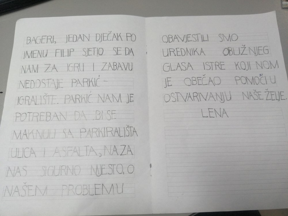 "DJECA IZ JAPODSKE PRIJE DESETAK DANA, JEDNOG SUNČANOG PODNEVA, DOK SE NAS DESETAK PRIJATELJA I PRIJATELJICA IGRALO NA ASFALTU PORED NAŠIH ZGRADA I ULICA KOJIM U JAPODSKOJ PROLAZE AUTOMOBILI, KAMIONI I BAGERI, JEDAN DJEČAK PO IMENU FILIP SJETIO SE DA NAM ZA IGRU I ZABAVU NEDOSTAJE PARKIĆ-IGRALIŠTE. PARKIĆ NAM JE POTREBAN DA BI SE MAKNULI S PARKIRALIŠTA, ULICA I ASFALTA, NA ZA NAS SIGURNO MJESTO. O NAŠEM PROBLEMU OVAVIJESTILI SMO UREDNIKA OBLIŽNJEG GLASA ISTRE KOJI NAM JE OBEĆAO POMOĆI U OSTVARIVANJU NAŠE ŽELJE".