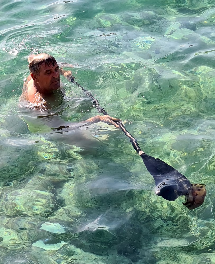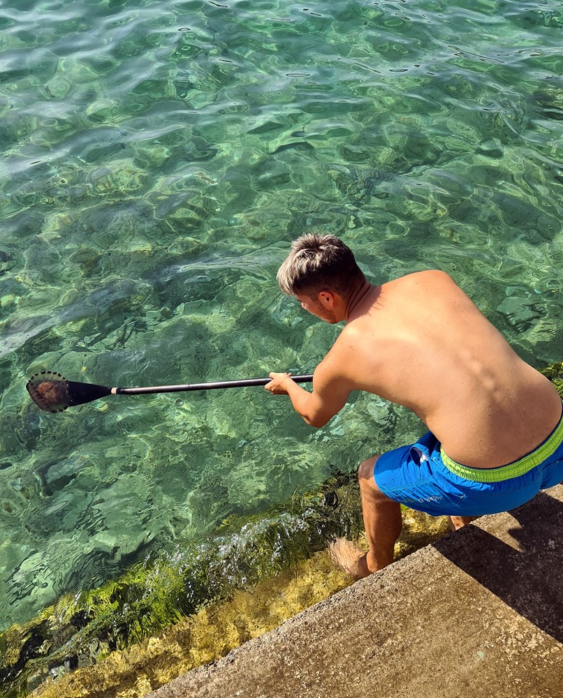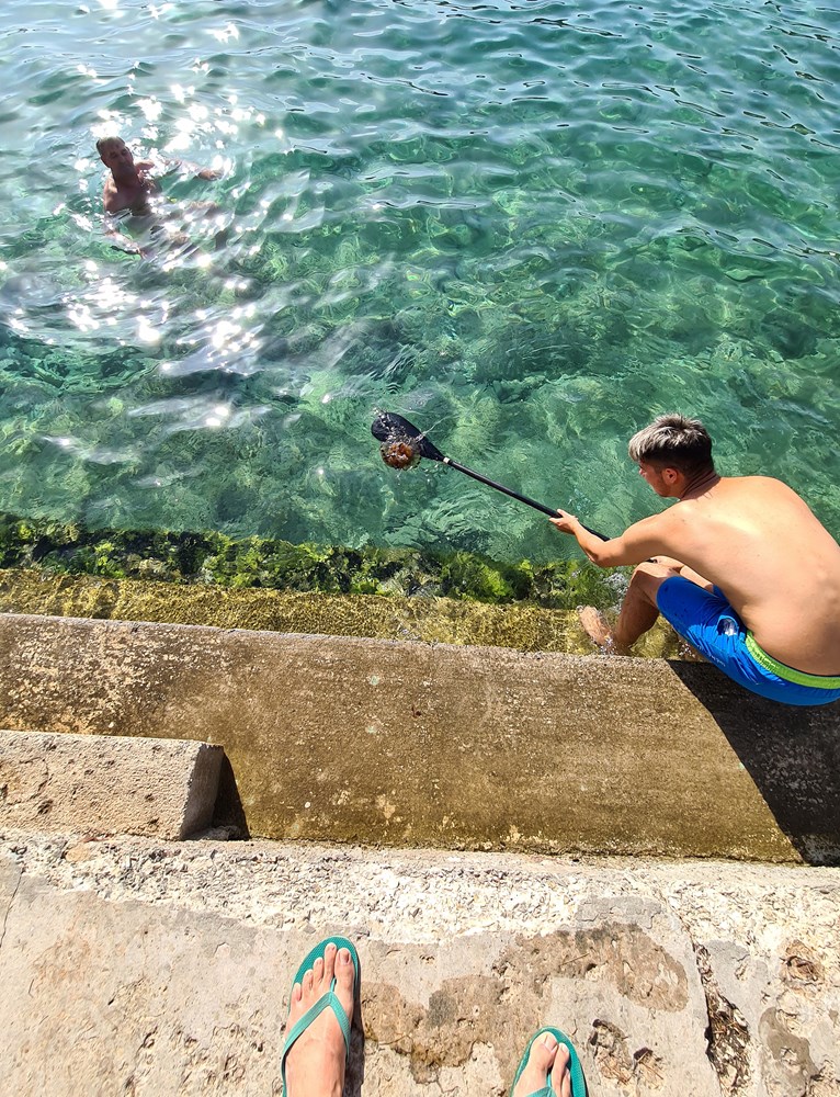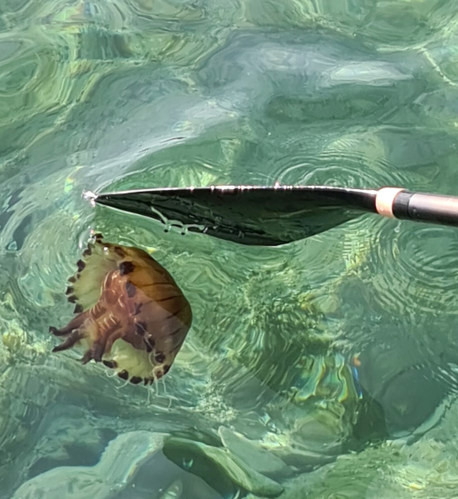 Djelatnik s obližnjeg "Wibita"- vodenog parka za napuhavanje, pokušavao je ukloniti veću opasnu meduzu, kao što se vidi na fotografiji.