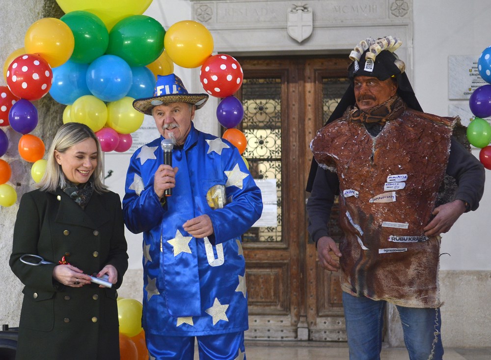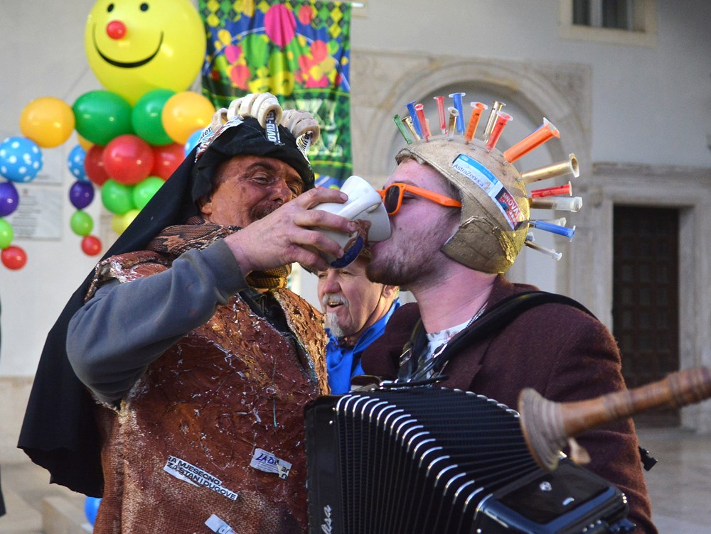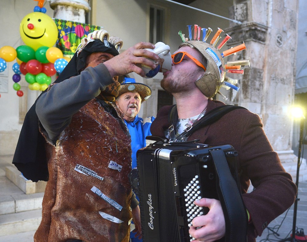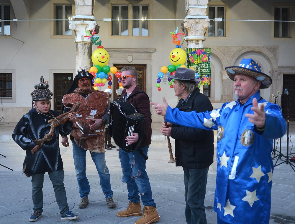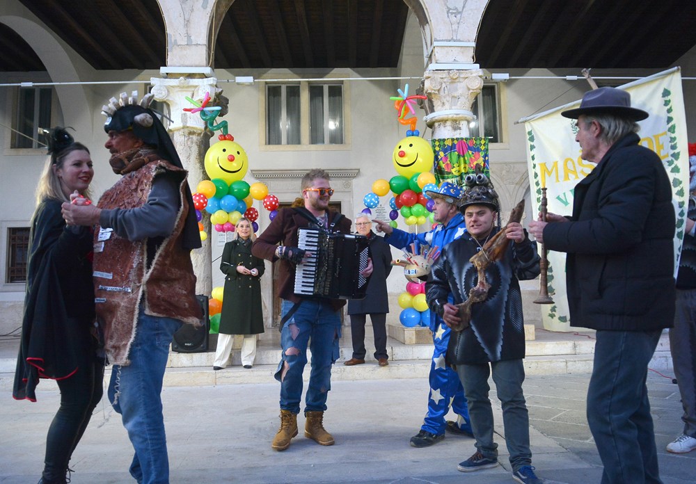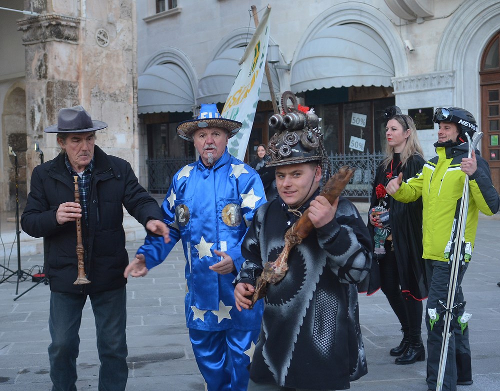 "To nas je inspiriralo zadnja tri dana. Tepla je i aktualna. Blato i glib do grla i korupcija i nepotizam. A zmija oko vrata i politička te steže i dobiješ strah u kosti od kovida i samo ujdeš - u maškare", poručio je Jurman nakon čega se uz zvukove harmonike i vino Forumom zaorila pjesma veselih maškara.