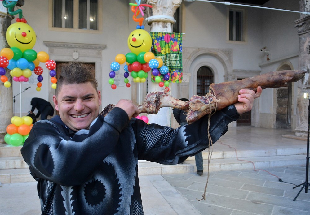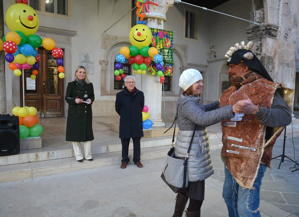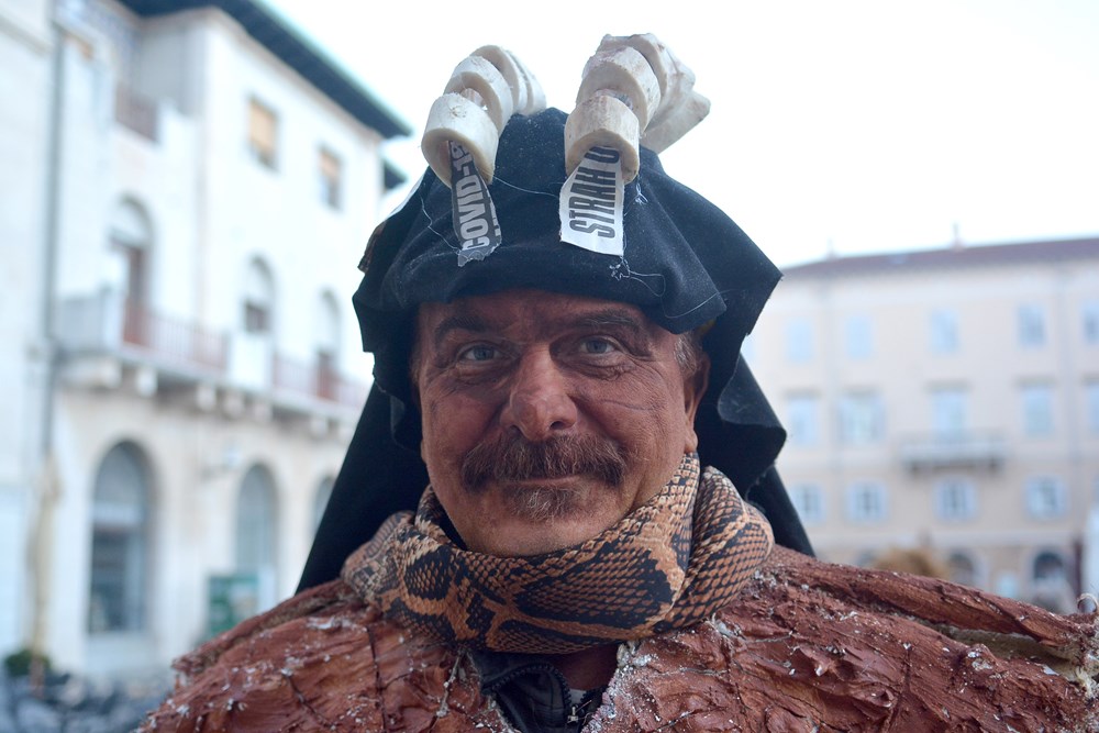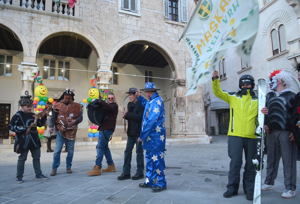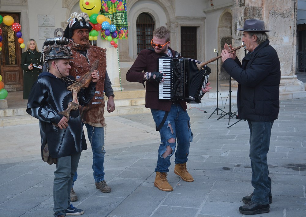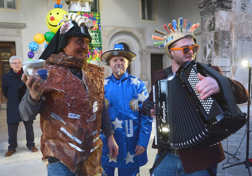 "To nas je inspiriralo zadnja tri dana. Tepla je i aktualna. Blato i glib do grla i korupcija i nepotizam. A zmija oko vrata i politička te steže i dobiješ strah u kosti od kovida i samo ujdeš - u maškare", poručio je Jurman nakon čega se uz zvukove harmonike i vino Forumom zaorila pjesma veselih maškara.