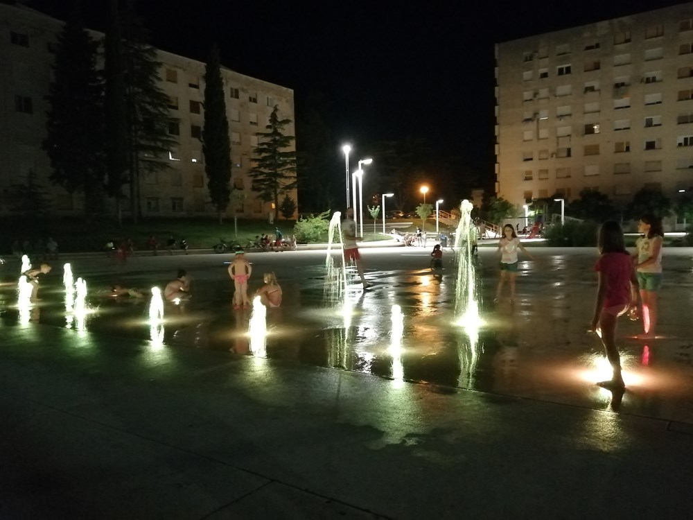 Trg Kralja Tomislava od preuređenja, definitivno je ispunio svoju svrhu. Sinoć je opet bila gužva. Djeca trče, skaču prolazeći kroz slapove vode, a neki čak nose i maske i naočale za plivanje. Od preuređenja, trg je postao okupljalište ne samo Verudeža jer dolaze i Puljani iz ostalih četvrti, a nerijetko svrate i Medulinci.