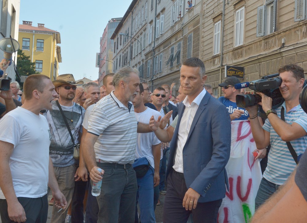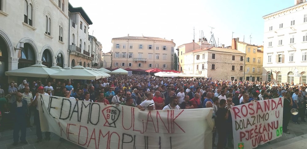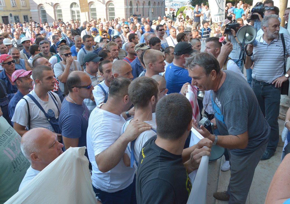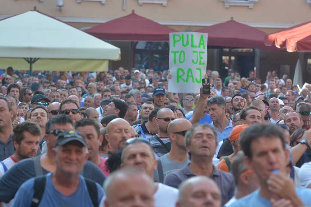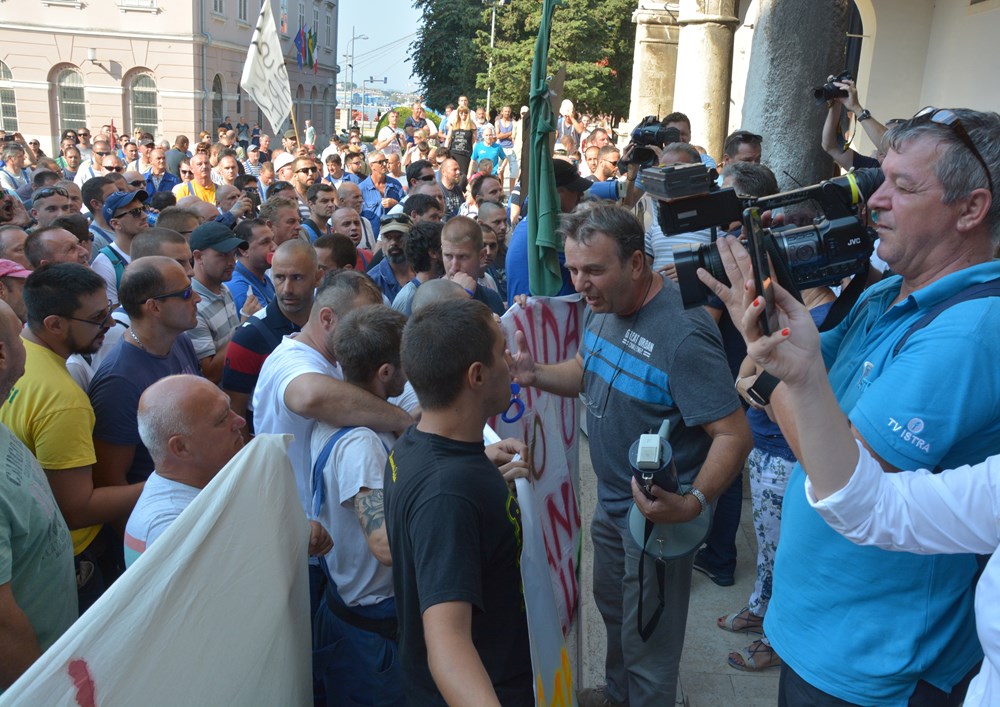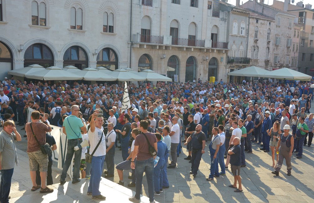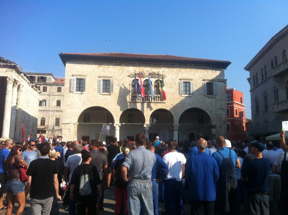 09:00 sati Prema procjeni policije na Forumu pred zgradom Gradske uprave okupilo se oko dvije tisuće radnika i građana koji su tražili da im se obrati gradonačelnik Miletić. Oštrica nezadovoljstva pritom je usmjerena i prema lokalnoj vlasti, pa se u nekoliki navrata čulo skandiranje "IDS lopovi" i "Mafija, mafija", ali i "Nećemo Končara". Radnici su ponovno zatražili smjenu uprave koja se ni danas nije obratila i spustila među radnike. U jednom trenutku masa ljudi se počela približavati ulazu u zgradu Uprave, ali su ulazak u nju spriječili pripadnici policije.