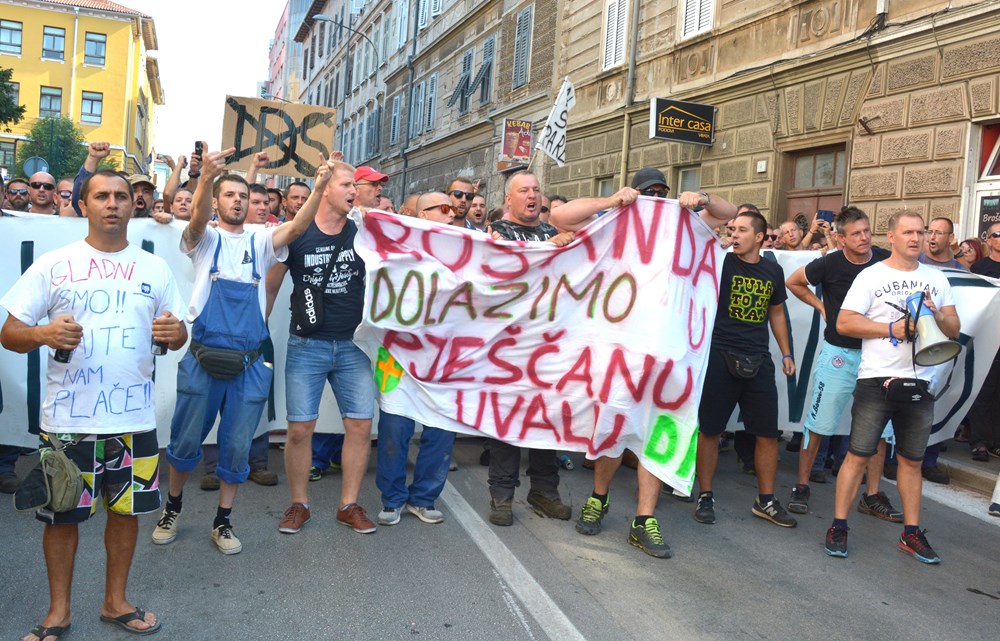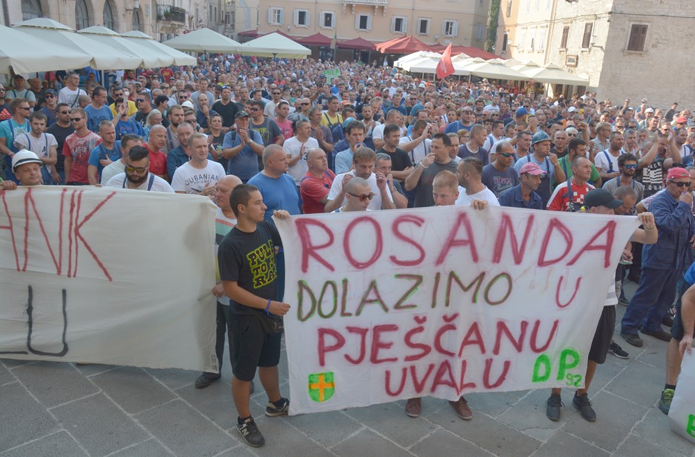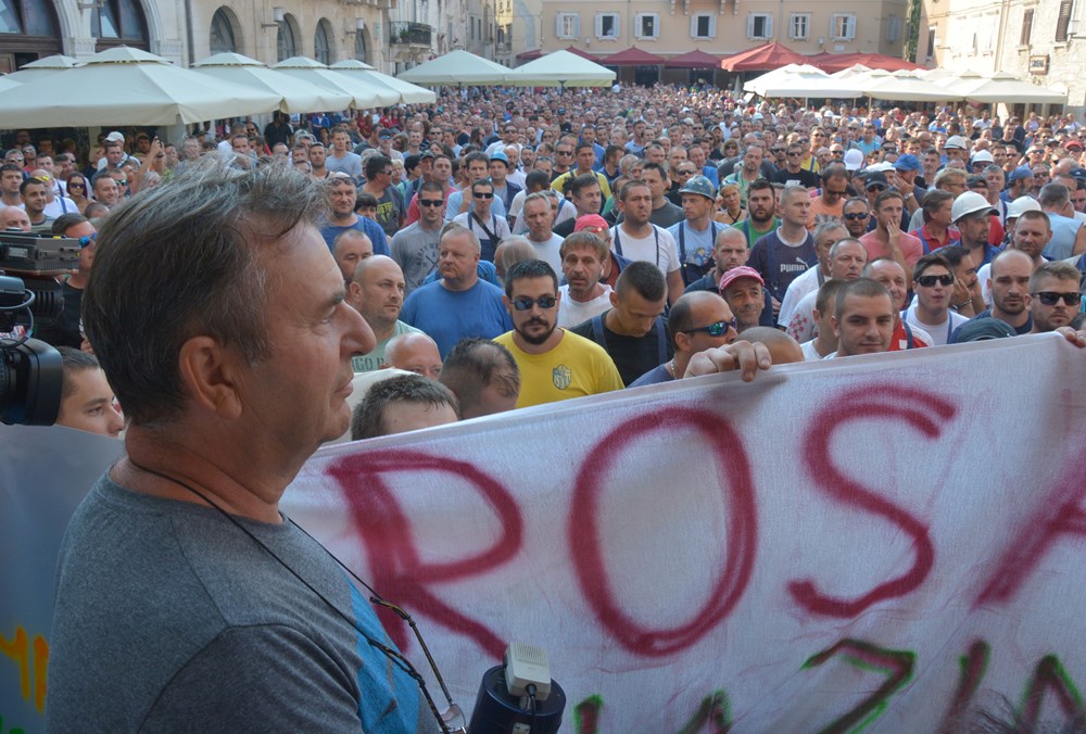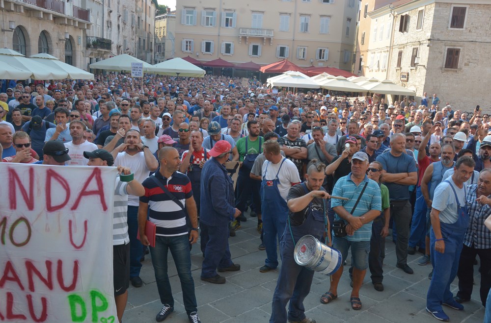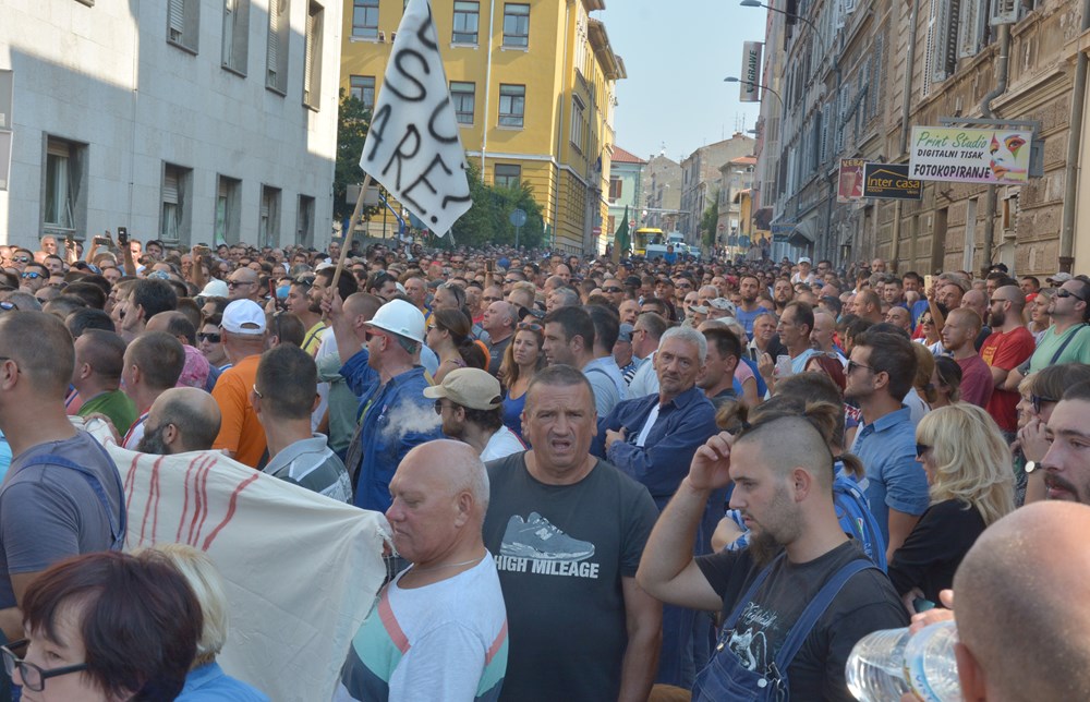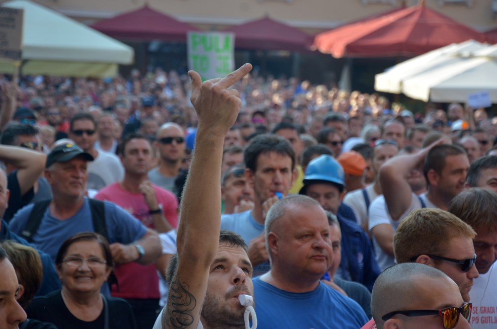 09:00 sati Prema procjeni policije na Forumu pred zgradom Gradske uprave okupilo se oko dvije tisuće radnika i građana koji su tražili da im se obrati gradonačelnik Miletić. Oštrica nezadovoljstva pritom je usmjerena i prema lokalnoj vlasti, pa se u nekoliki navrata čulo skandiranje "IDS lopovi" i "Mafija, mafija", ali i "Nećemo Končara". Radnici su ponovno zatražili smjenu uprave koja se ni danas nije obratila i spustila među radnike. U jednom trenutku masa ljudi se počela približavati ulazu u zgradu Uprave, ali su ulazak u nju spriječili pripadnici policije.
