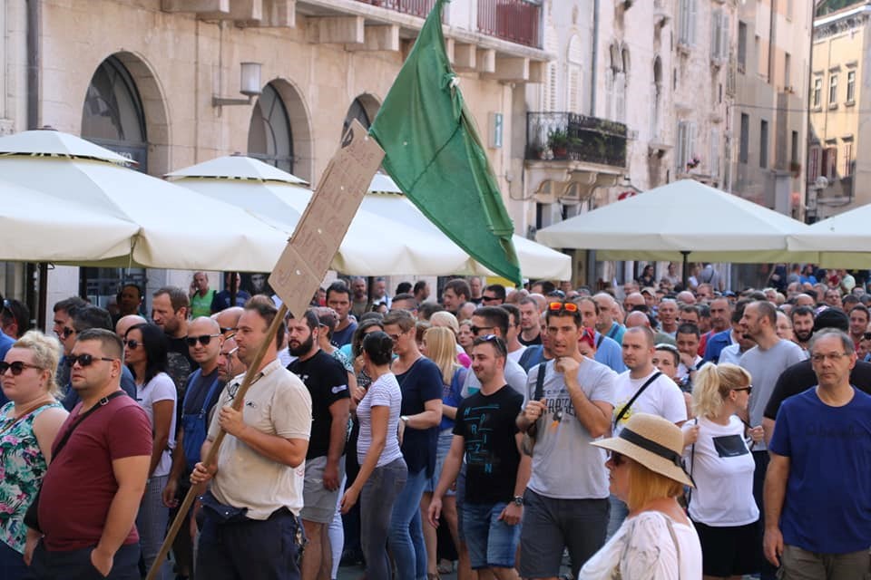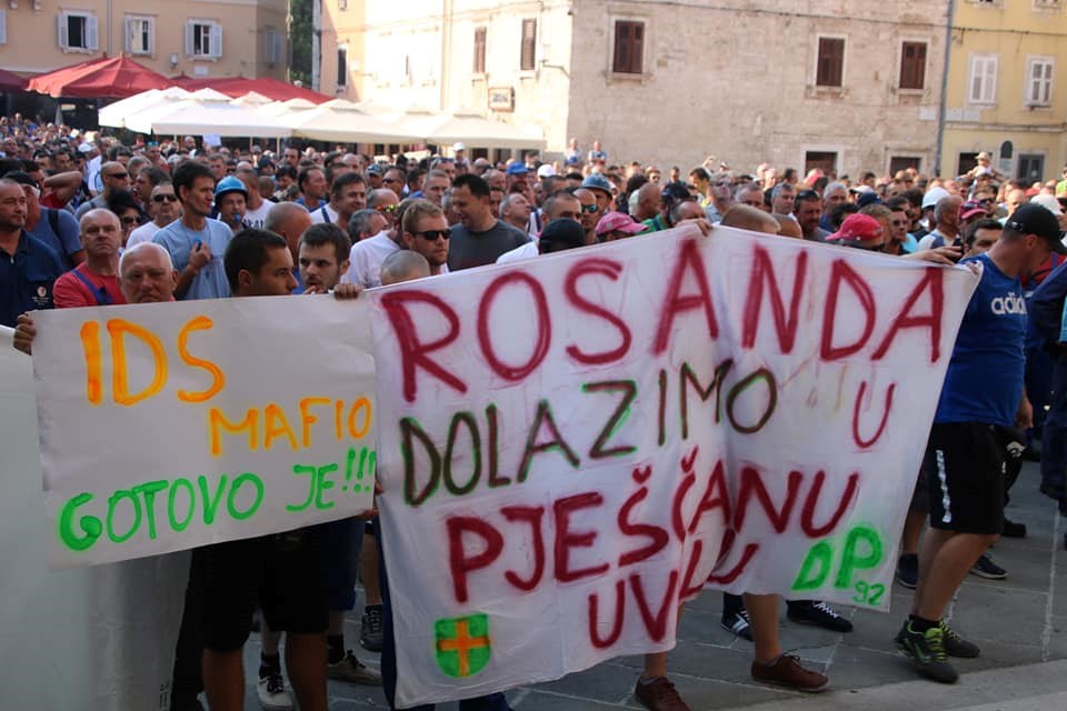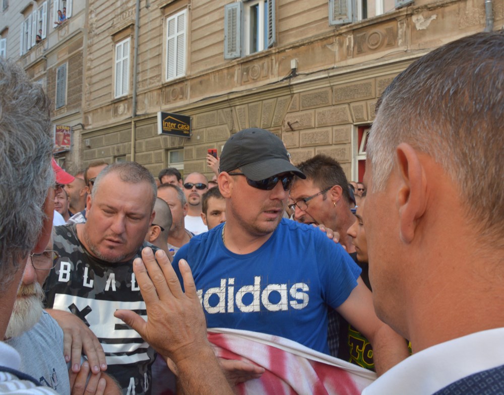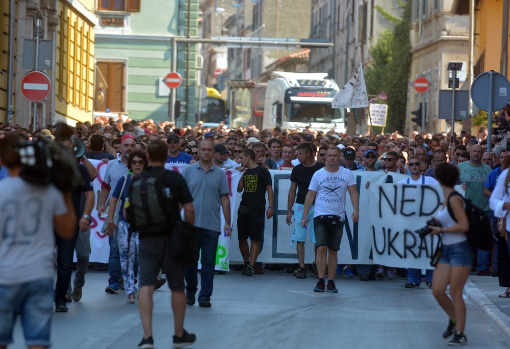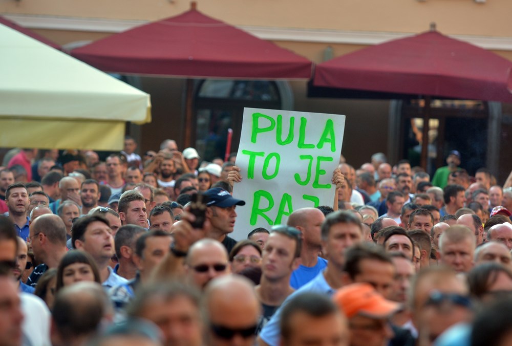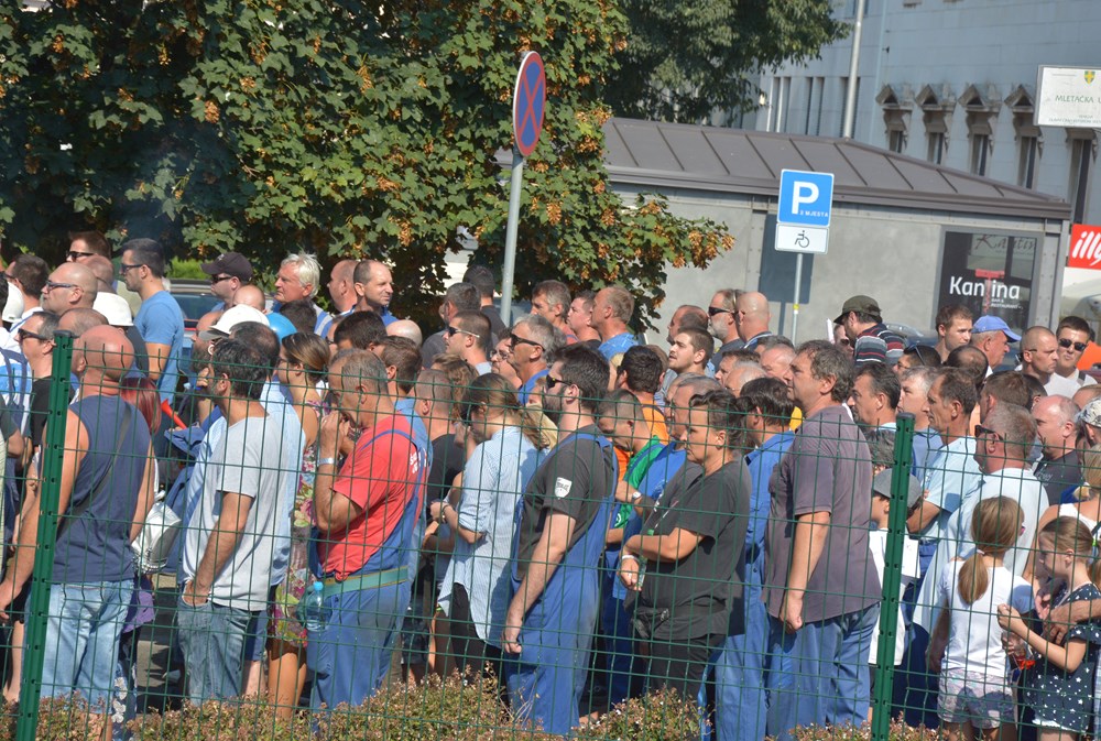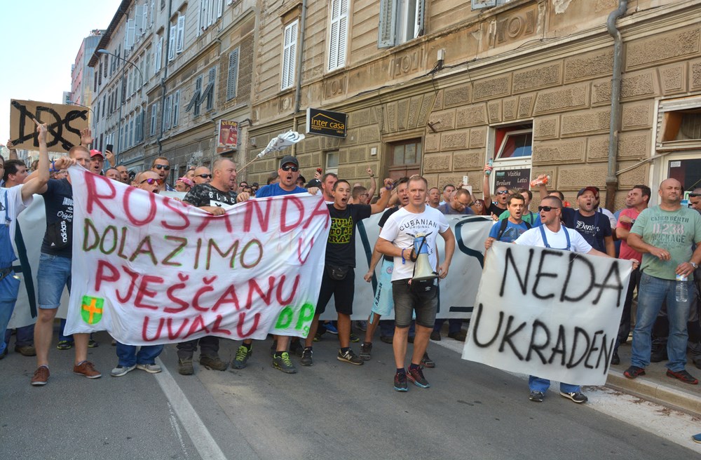 09:00 sati Prema procjeni policije na Forumu pred zgradom Gradske uprave okupilo se oko dvije tisuće radnika i građana koji su tražili da im se obrati gradonačelnik Miletić. Oštrica nezadovoljstva pritom je usmjerena i prema lokalnoj vlasti, pa se u nekoliki navrata čulo skandiranje "IDS lopovi" i "Mafija, mafija", ali i "Nećemo Končara". Radnici su ponovno zatražili smjenu uprave koja se ni danas nije obratila i spustila među radnike. U jednom trenutku masa ljudi se počela približavati ulazu u zgradu Uprave, ali su ulazak u nju spriječili pripadnici policije.