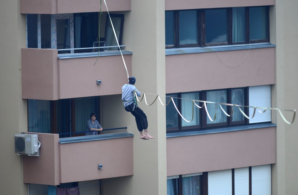 gušt", kaže nam ekipa "nebeskih hodača" koja se unatrag nekoliko dana okupila na krovu zgrade u Divkovićevoj ulici i krenula hodati po gurtni protegnutoj do susjedne zgrade. Bio je to spektakl koji je potrajao cijeli vikend, okupio brojne ljubitelje adrenalina, ali i susjede te prolaznike koji su se u čudu okupljali i gledali vratolomije u zraku.