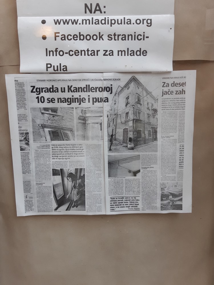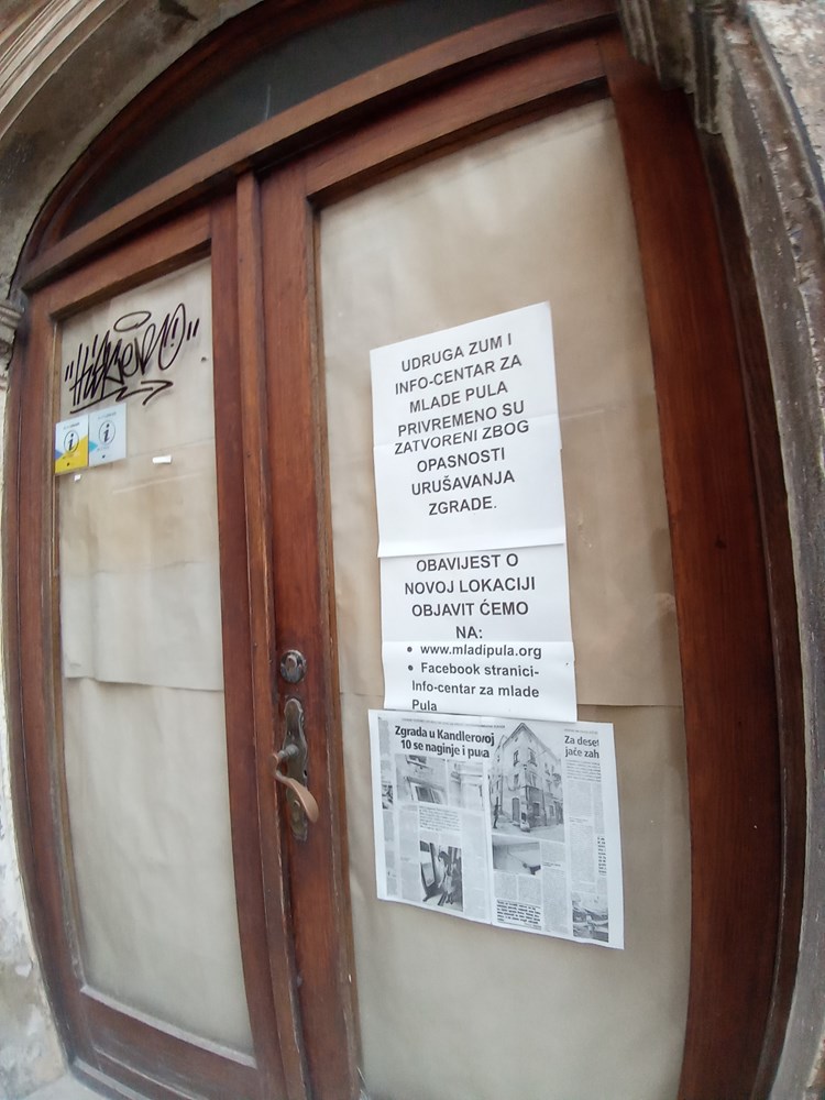 Nakrivljenu zgradu sigurno ste primijetili dok ste prolazili Kandlerovom, tim više što na vratima i dalje stoji članak Glasa Istre od prije tri godine pod naslovom "Zgrada u Kandlerovoj 10 se naginje i puca", kada je iz gradskog poslovnog prostora u prizemlju radi sigurnosnih razloga iseljena udruga Zum. Loša statika zgrade uočena je još 2001. godine, a tijekom preseljenja Udruge 2017. upozorili su na veliku opasnost od urušavanja. Od tada sve stoji i ništa nije poduzeto. U odluci Grada od prije tri godine zapisano je da će udruga Zum boraviti u zamjenskom prostoru u Flavijevskoj 8 do konačnog rješenja poslovnog prostora u kojemu su dotad bili, što će očigledno još jako dugo potrajati.