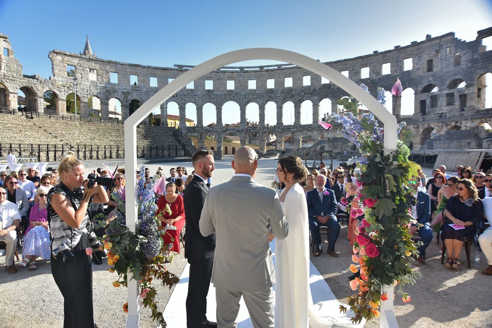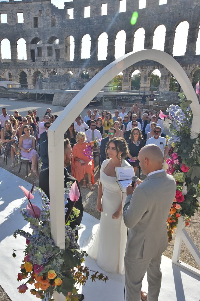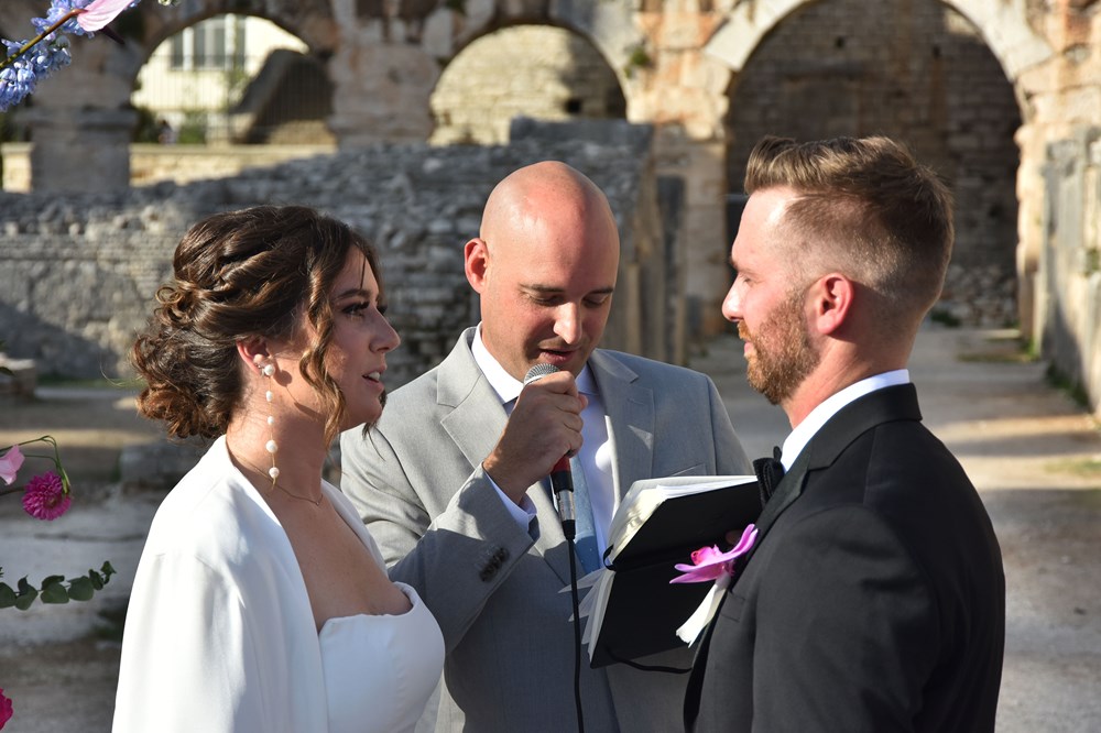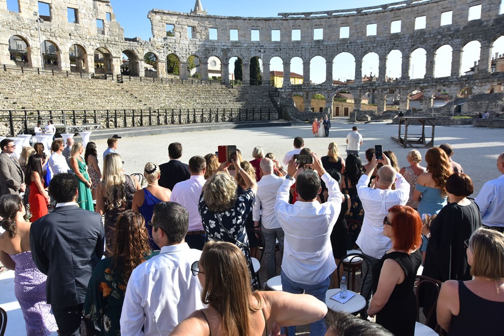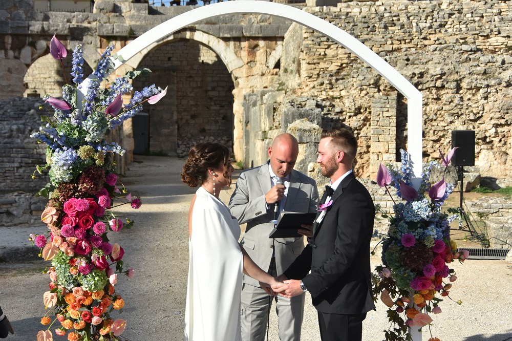 Danas se u pulskoj Areni zbio nesvakidašnji događaj, a radi se o obredu vjenčanja mladog bosansko-američkog para. Unutar zidina našeg amfiteatra vjenčali su se Anja Hrescak i Christopher Wascak. Prisutno je bilo 80-ak gostiju, što Amerikanaca, što naših, a ovaj su čin zabilježile i kamere Glasa Istre. O svemu smo pitali majku mladenke, koja je pristala ispričati nam o čemu se tu zapravo radi, tko su sretni mladenci i zašto su odabrali baš Arenu.