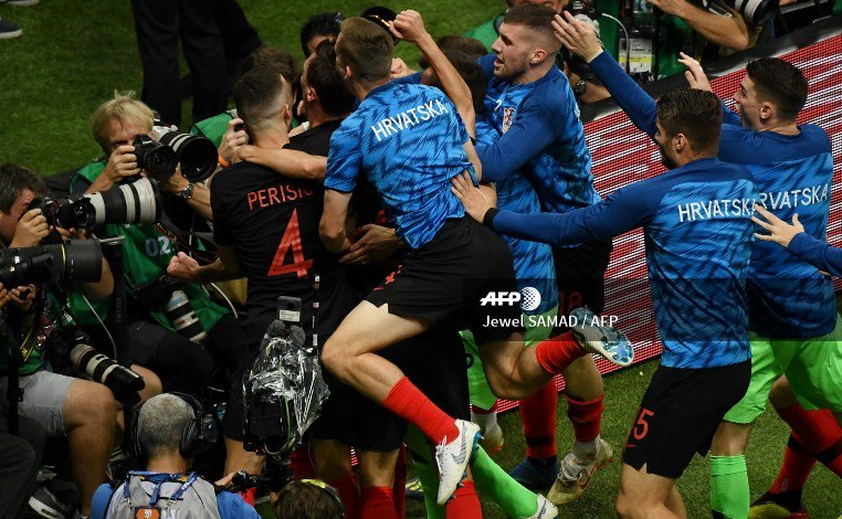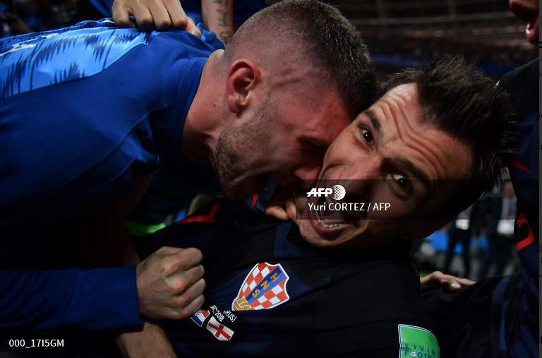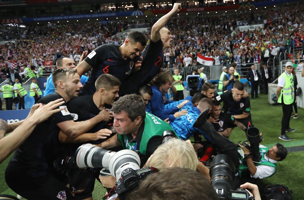 Nakon pogotka Mandžukića u 109. minuti utakmice cijela hrvatska reprezentacija krenula je slaviti i otrčala prema kornerliniji, a tamo su zatim pali na fotografa Yurija Corteza.