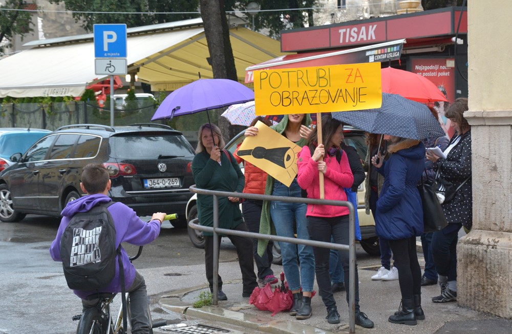 Predsjednik Nezavisnog sindikata zaposlenih u srednjim školama Branimir Mihalinec dio članstva okupio je na Trgu žrtava fašizma, jer se ondje nalazi središnjica HDZ-a.