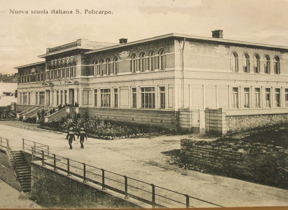 Osnovna škola sv. Polikarpa iz 1912., pod Italijom s imenom "Alessandro Manzoni", bila je jedna od najljepših zgrada u Puli. Projektirao ju je inženjer Guido Brass, a posebno se isticala ornamentika s impozantnim freskama, djelo Tršćanina Pietra Lucana. Škola je terasom i ogradom bila podignuta od ulice Helgoland koja je pratila današnju Jeretovu ulicu.