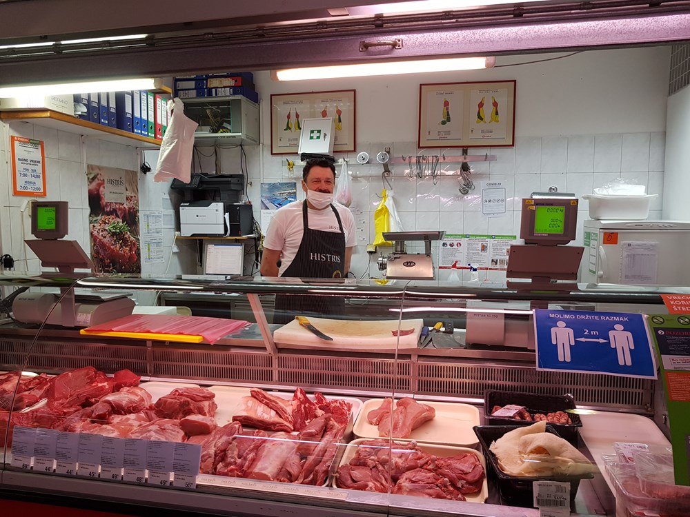 "Je ča je. Nema mušterija. Jako je loše", kaže nam Silvano Stanić, jedan od nekoliko mesara strateški raspoređenih u gotovo pustoj zgradi Tržnice, u koju se građani pripuštaju samo s jednog ulaza, onog bližem kamenim bancima. Na ulazu stoji stameni zaštitar Crnog vjetra, odjeven, naravno, u crno, sa crnom zaštitnom maskom na licu. Pored njega stolić sa sredstvom za dezinfekciju ruku. Na zidu plakat s uputama za korištenje zgrade: kupci moraju biti međusobno udaljeni dva metra, a u zgradi ih može biti najviše deset.