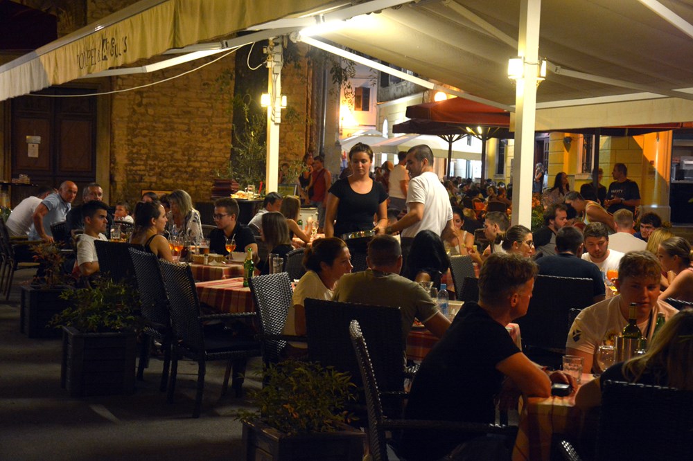 S Foruma skrećemo prema rivi. Ovdje, jednu ulicu iza svjetala pozornice, buka prestaje. Prolazimo pored praznog i tihog Arsenala, čija su svjetla pogašena. No, terasa istoimenog kafića preko puta, koji se nalazi na mjestu nekadašnje ćevabdžinice, krcata je. U fino uređenom interijeru promatramo crno - bijele fotografije nasmiješenih brodograditelja iz nekih minulih, prosperitetnih vremena. Kad se proizvodilo, a od proizvodnje živjelo. (M. VERMEZOVIĆ IVANOVIĆ)