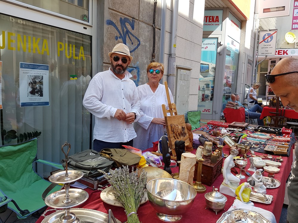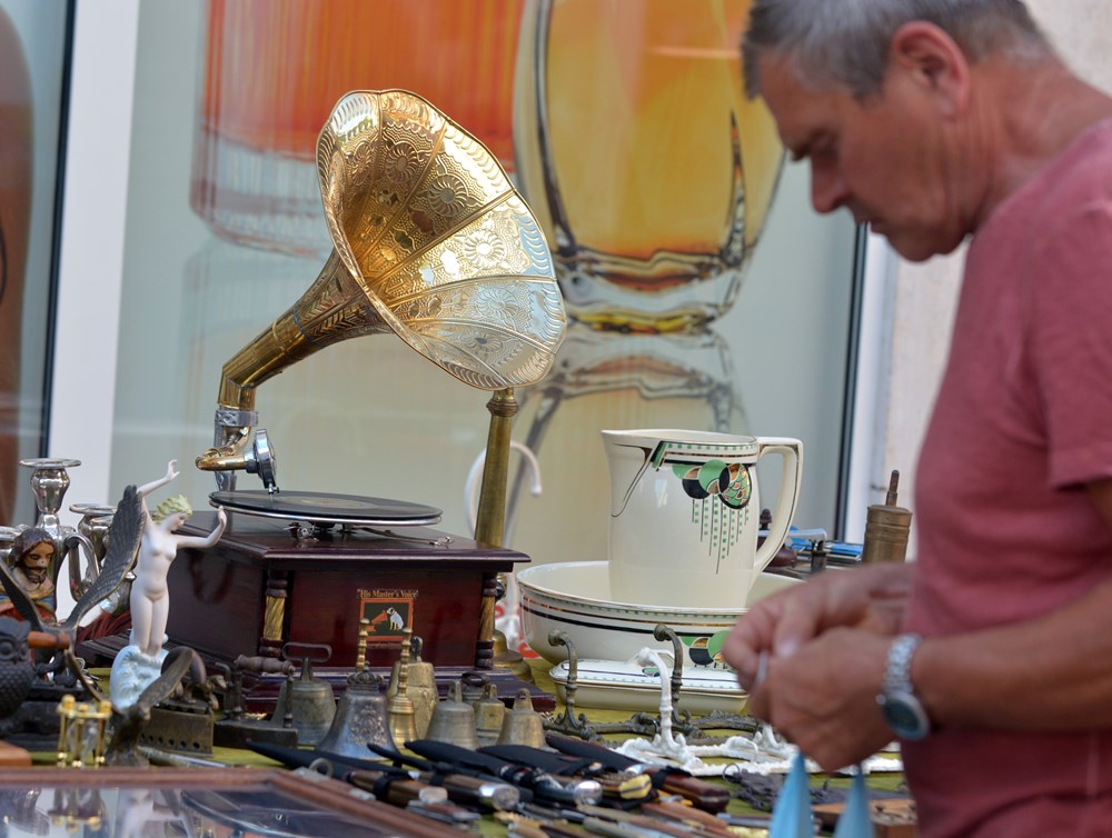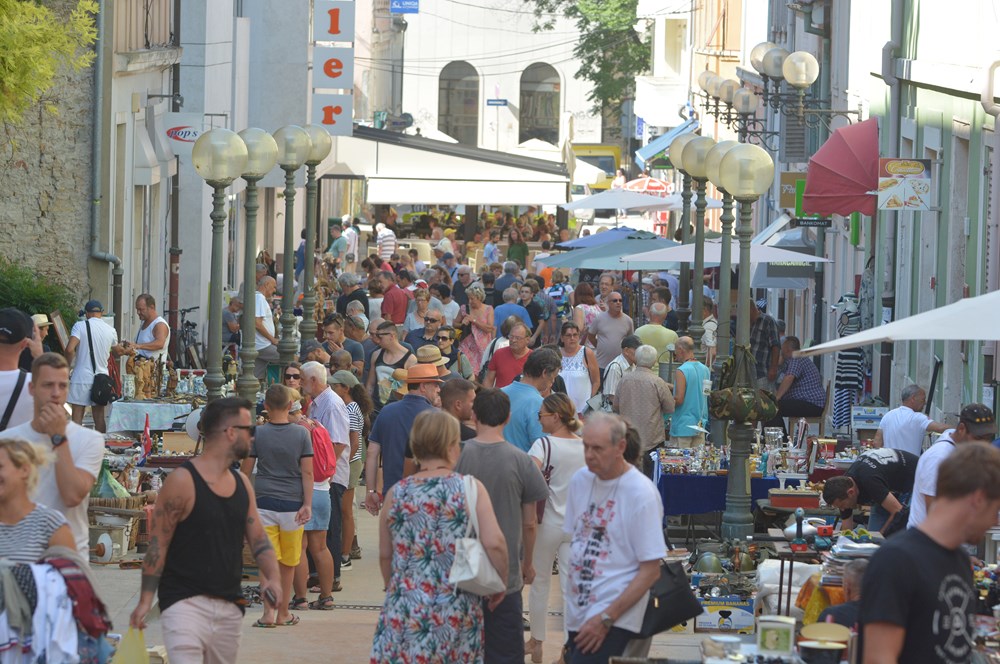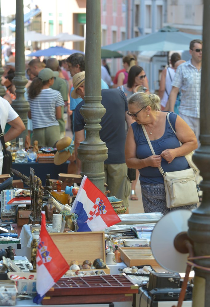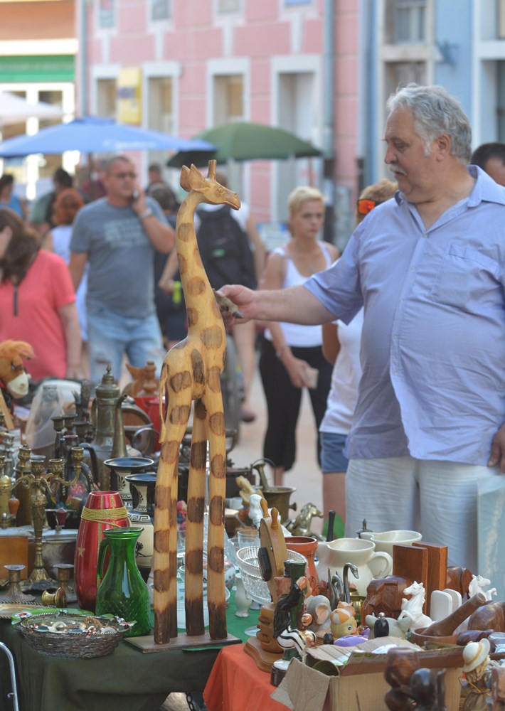 Subota je, deseci ljudi tiskaju se oko štandova. Od prošlog tjedna sajam je otvoren svaki dan. Špica se zahuktala, ne možeš prolaziti od turista. Probijam se laktovima. Cijela se ulica kliže, posuta crvenim pijeskom. Prodavači se žale da je pijesak bačen preko ulja koje je bilo proliveno po središtu grada. Na sajmu starina ima svega, i starog i novog, a samo će vješto oko prepoznati je li nešto doista staro i vrijedi li toliki novac. Starine se dobavljaju kod poznatih kupaca, ali i na raznim europskim sajmovima, poput ovog. Cjenkanje ovdje uvijek prolazi.