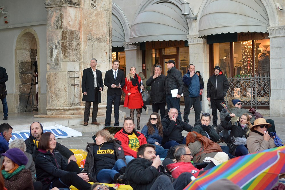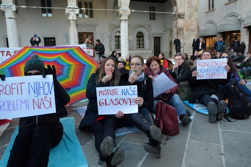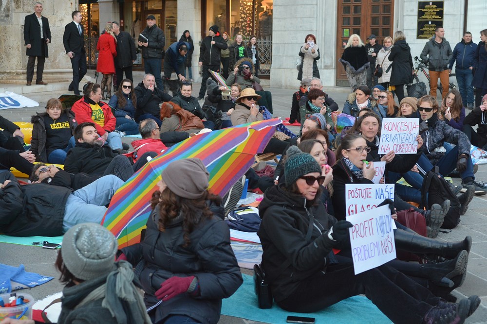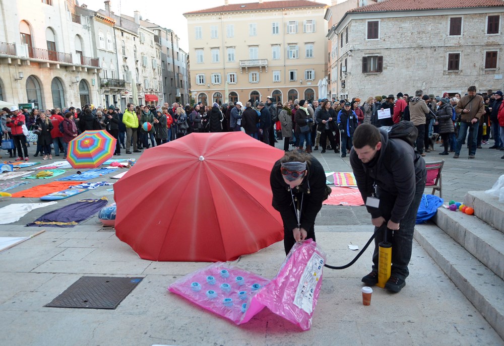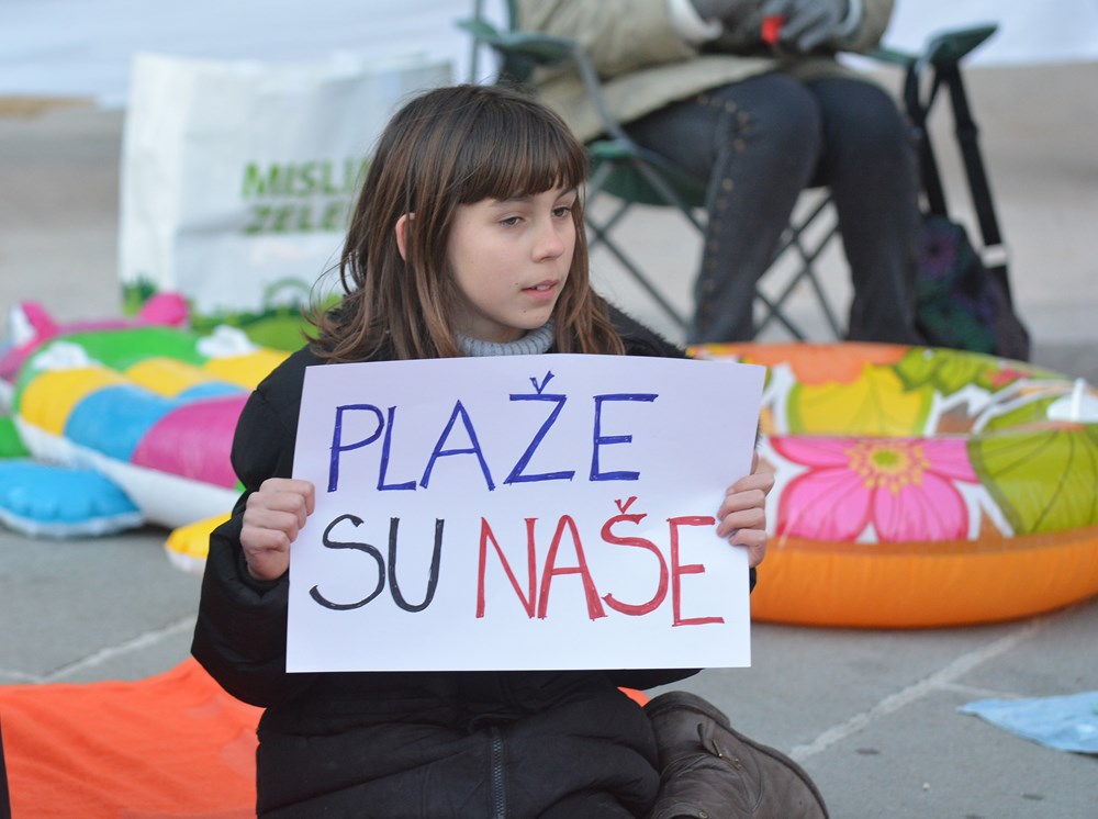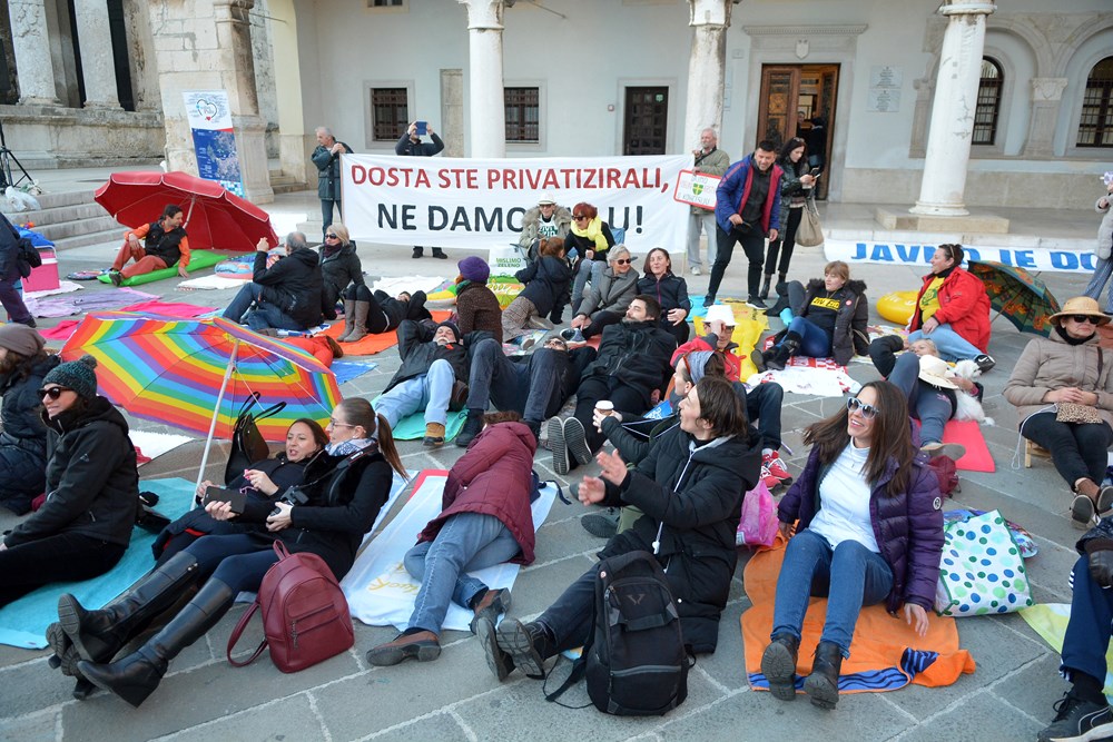 "Poderali smo uši, al barem malo da im je laštik u gaćama napuknuo", kazao je Grbac te pozvao prosvjednike da se ispruže na šugamanima iznad kojih je stajao veliki transparent "Dosta ste privatizirali" jer "tko zna hoće li ikad više to moći učiniti na plažama koje će biti prekrivene plastičnim ležaljkama". Građani su to i učinili, noseći transparente s natpisima: "Plaže su naše", "Poštujte naše glasove", "Profit njihov, problemi naši", "Dajmo poglavarstvo u koncesiju".