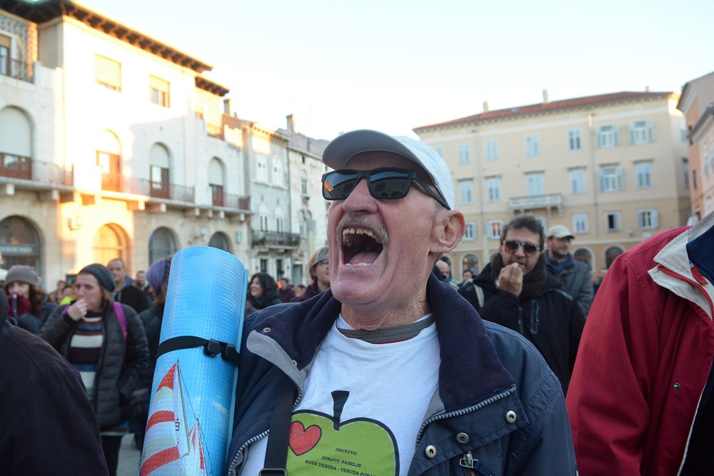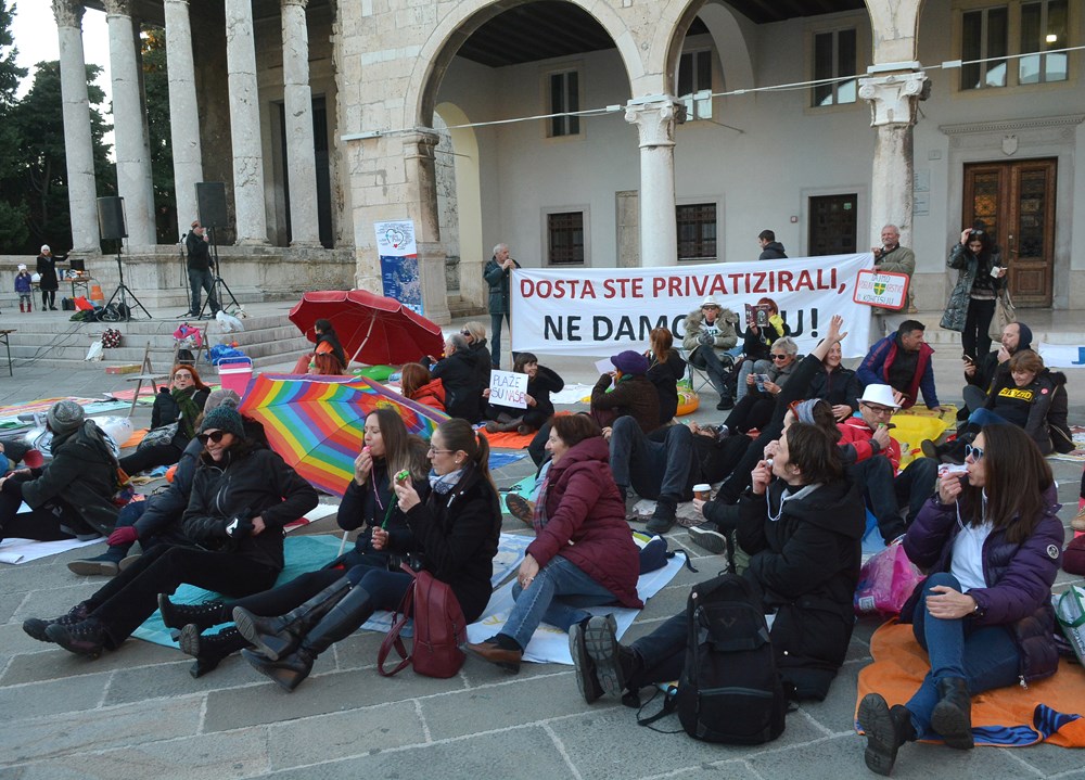 Prosvjed je počeo u 16.30, pola sata prije početka sjednice: vijećnike IDS-a Ardemia Zimola i Valtera Boljunčića na ulazu u Palaču prosvjednici su izviždali. U razgovoru s voditeljem prosvjeda Markom Grbcem Boljunčić je pokušao objasniti razliku između koncesije i koncesijskog odobrenja, ali je nakon zvižduka napustio improviziranu govornicu. Vijećnica SDP-a Sanja Radolović poručila je da će glasati protiv predloženih odluka. Obrazlažući svoje protivljenje, u Inicijativi tvrde da bi Grad od koncesija prihodovao daleko manje u odnosu na koncesijska odobrenja koja su se dosad izdavala. Svega trećina prihoda išla bi Gradu, trećina Županiji, a trećina državi, kazala je predsjednica Zelene Istre Dušica Radojčić.