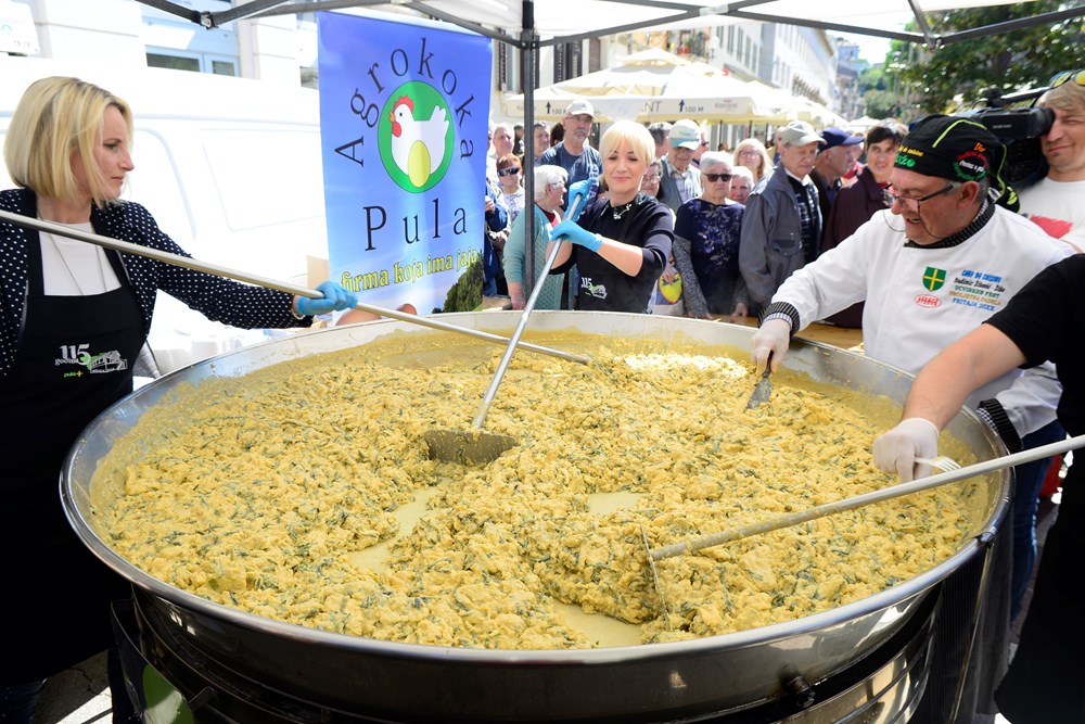 Uoči uskrsnih blagdana, pulska Tržnica u subotu je za sve posjetitelje organizirala tradicionalnu fritaju sa šparugama. Pripreme za mega fritaju u velikoj pulskoj padeli započele su već oko 10 sati kada se na gradskoj tržnici već okupio velik broj Puljana koji su obavljali posljednje pripreme sa sutrašnji blagdan. Kako bi fritaja bila baš onako kako treba, pobrinuo se glavni kuhar Budimir Žižović Žižo koji je umutio čak 1.500 jaja. U fritaji je bilo i 20 kilograma šparuga, pet kilograma mladog luka i sedam litara maslinovog ulja, a sve se to potom na laganoj vatri pažljivo miješalo još najmanje 45 minuta.