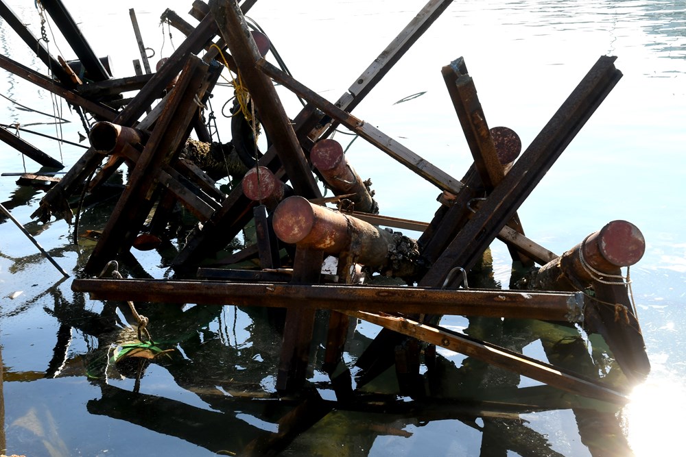 Hrpa rđavih stupova koje su radnici izvukli na obalu podsjeća na umjetničku instalaciju kakvog suvremenog autora. No, prava je umjetnost uz pomoć dizalice "povući" stupove i konstrukciju mola izgrađenu od šina. Potrebno je prvo barkom dovući brage do mola, privezati zahrđale stupove i onda dizalicom snažno povući. Radnici koje smo jučer ondje zatekli kažu da sve teče glatko, nema problema s eventualnim zapinjanjem stupova koje su odavno izgrizli sol i more.