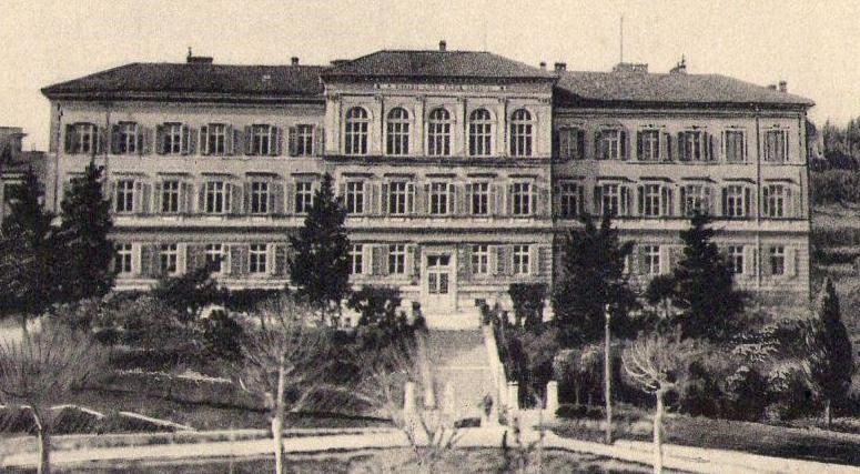 Gimnazija na njemačkom jeziku svoje korijene prati još iz 1836., kada je osnovana u pazinskom Franjevačkom samostanu, a 1873. dobiva status državne gimnazije. Ona se 1890. seli u Pulu pod nazivom K. u. K. Staats-Gymnasium i smještena je u zgradu sagrađenu iste godine. Podignuta je u historicističkom stilu na istočnoj padini središnjeg gradskog brežuljka Kaštela. Uvučena je od Carrarine ulice, ne bi li se sačuvala Herkulova i Dvojna vrata