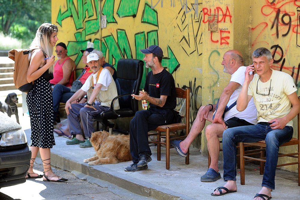 U prizemlju susjedne zgrade, na Akvilejskom prilazu čeka nas gotovo isti scenarij. Iza velikog natpisa "Šavrić", ugašenog domaćeg drvno-proizvodnog poduzeća, nema ničega. Samo prašnjavi izlozi još jednog praznog prostora, također prodavaonice namještaja, Istradoma. Naizgled nema ni ljudi. Čak je i park pust. No, život pulsira odzada, skriven od očiju znatiželjnika. Tamo, iza malog neuglednog dućana, svjedočimo sasvim nekonvencionalnom, čudnovatom sastanku mjesnog odbora, onog u sjeni. Mjesto je to gdje se svakodnevno druži nekolicina mještana ovog dijela grada. Poredani uz sam rub zgrade, sjede na foteljama i stolicama iz "domaće radinosti". Ispijaju pivo i zbijaju pošalice. Nekoliko pasa vrzma im se pod nogama, traže hladovinu. Žega je, a povjetarca ni u tragovima. Rani su jutarnji sati, no asfalt je već užaren.