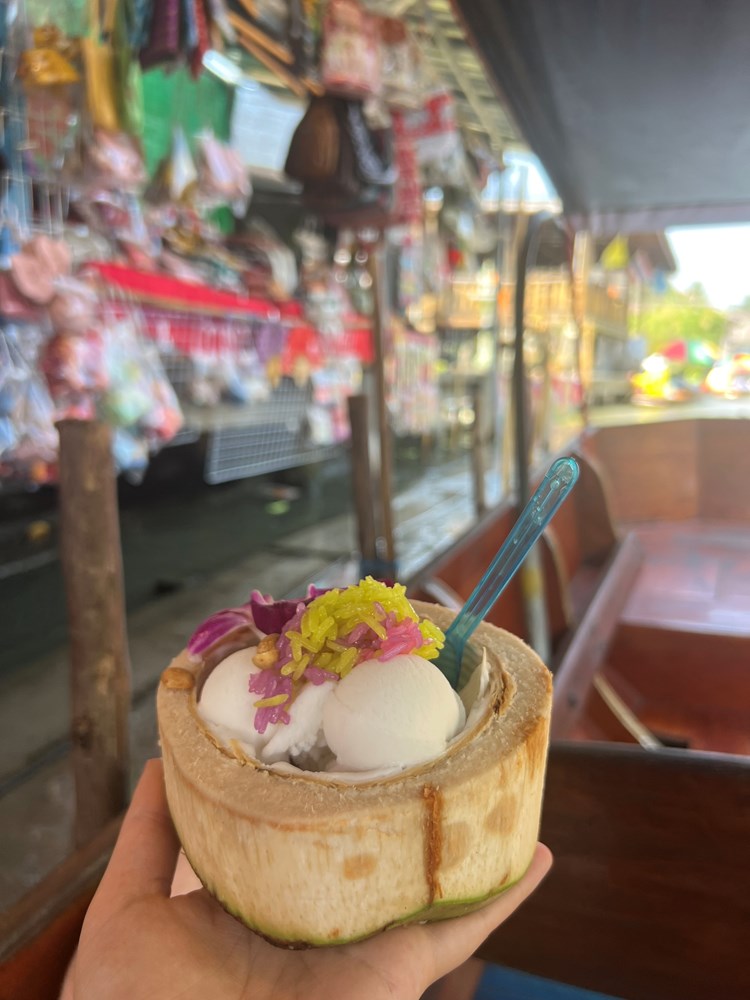 Najbolji sladoled od kokosa kušali smo na plutajućoj tržnici Damnoen Saduak. Iako su mišljenja turista za ovu atrakciju podvojena, nama je to bio pravi doživljaj. Iz kanua se cjenkaš s prodavačima, možeš kupiti sve - od igle do lokomotive, a vožnju kanalom prati džungla s obje strane. No, valja reći da su cijene ondje skuplje nego na drugim lokacijama. Najjeftiniji suveniri i voće mogli su se pronaći na tržnici Mae Klong gdje prolazi popularni vlak.
