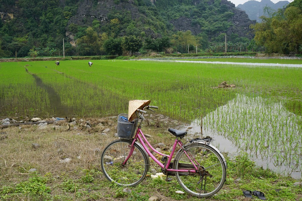 Stotinjak kilometara južnije od Hanoija na području sela Tam Coc i Trang An uzdiže se spektakularan krajolik vapnenačkih vrhova i strmih stijena prožet dolinama, rijekama, kanalima i rižinim poljima. Zovu ga i Ha Long Bay na kopnu. Naplavljena polja zrcale svu ljepotu zemlje i nebesa, i visokih stijena između njih. Vožnja biciklom uskim puteljcima među rižinim poljima otkriva vrijedne seljake sa svojim slamnatim šeširima zaštićene od jakog sunca kako se skoro do koljena u naplavljenim poljima brinu o budućem usjevu, zatim goveda koja slobodno lutaju utabanim stazama često rame uz rame s rijetkim prolaznikom ili biciklistom te naposljetku kućice s obaveznom garniturom gusaka i patki uz srdačan osmijeh i pozdrav domaćina i njegova psa. Osobita neobičnost su groblja i grobnice uz i usred natopljenih rižinih polja, što se pak posvuda u ruralnom Vijetnamu može primijetiti. Prema staroj tradiciji Vijetnamci bi pokapali svoje umrle u grobnice uz rižina polja uz koja su nekada živjeli i na kojima su radili, da bi ih nakon tri godine iskapali i skupljene kosti prebacili u obiteljske grobnice na konvencionalna groblja. Jedno objašnjenje takvog običaja je zazivanje dobrog uroda uz prisustvo i blagoslov svojih predaka.