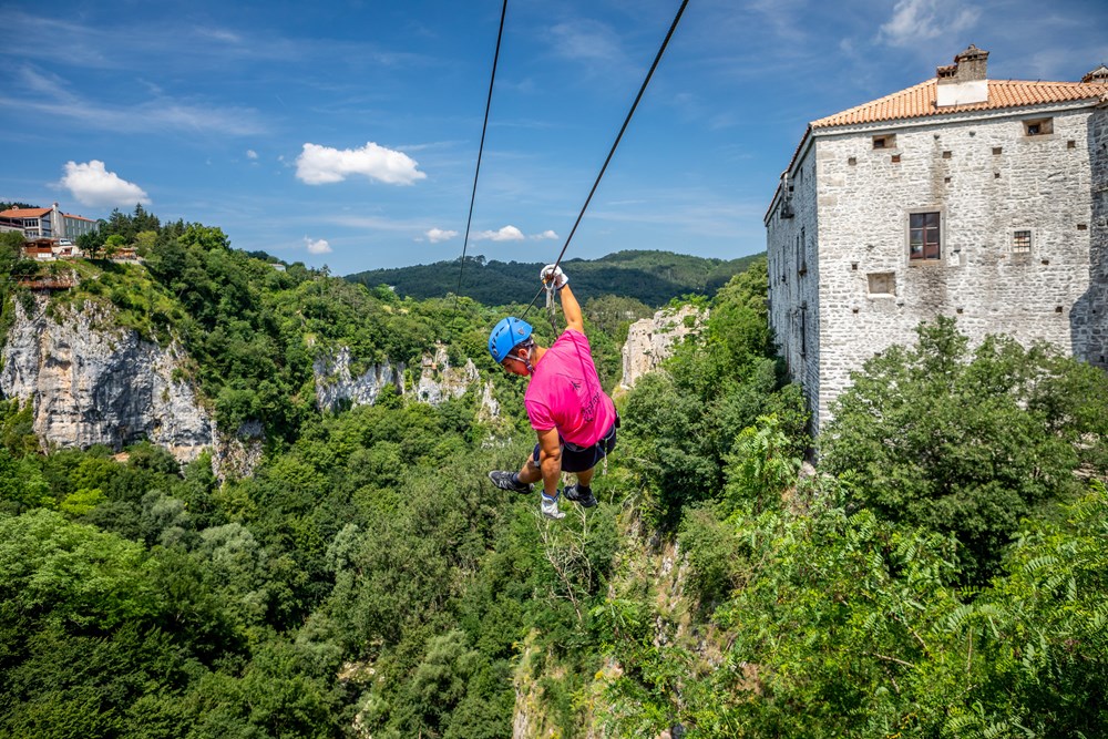 Adrenalinski naboj možete ispucati i na način da Pazinsku jamu preletite kao ptica u izuzetno uzbudljivoj i atraktivnoj vožnji 220 metara i 280 metara dugim linijama Zip linea na kojem ćete u letu stotinjak metara od tla postići brzinu od 50-ak kilometara na sat. Ako ste već na toj lokaciji ne propustite priliku posjetiti sam Kaštel, impozantnu građevinu u kojoj su danas smješteni Etnografski muzej Istre i Muzej grada Pazina. Etnografski muzej Istre sadrži 7.500 predmeta, u prvom redu tekstila, poljoprivrednog alata te predmeta iz svakodnevnog života istarskog sela s kraja 19. i početka 20. stoljeća, dok u Muzeju grada Pazina možete vidjeti stalne izložbe četiri zbirke: Pazin i okolica od prapovijesti do ranog srednjeg vijeka, Pazinski kaštel i bune kmetova 15. i 16. stoljeća, Zbirka crkvenih zvona te Izložba o životnom putu i djelu biskupa Jurja Dobrile.