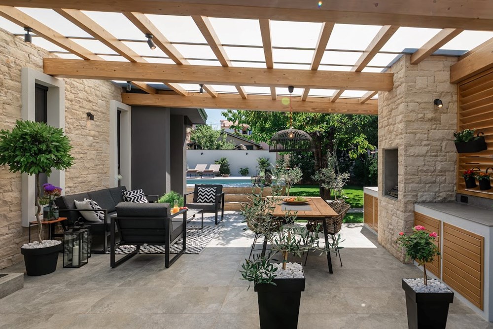 Velebno dvorište prostire se na 250 četvornih metara, stoga je idealan prostor za rekreaciju, roštiljanje, dječju igru ili jednostavno uživanje. Dvorište vile Villette skriva i vanjski bazen kako bi gosti mogli uživati pod sunčanim novigradskim nebom, kad god im temperature zraka to dopuštaju. Zbog svog uređenja, pozicije i prekrasnog dvorišta, vila Villetta je idilično mjesto za odmor svih 365 dana u godini.