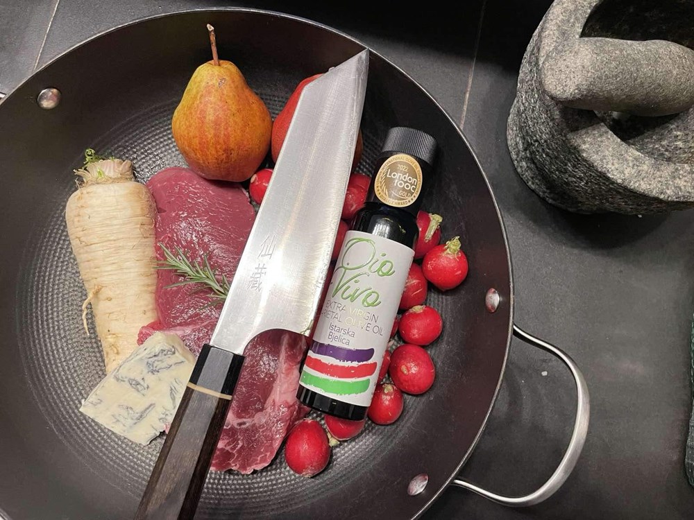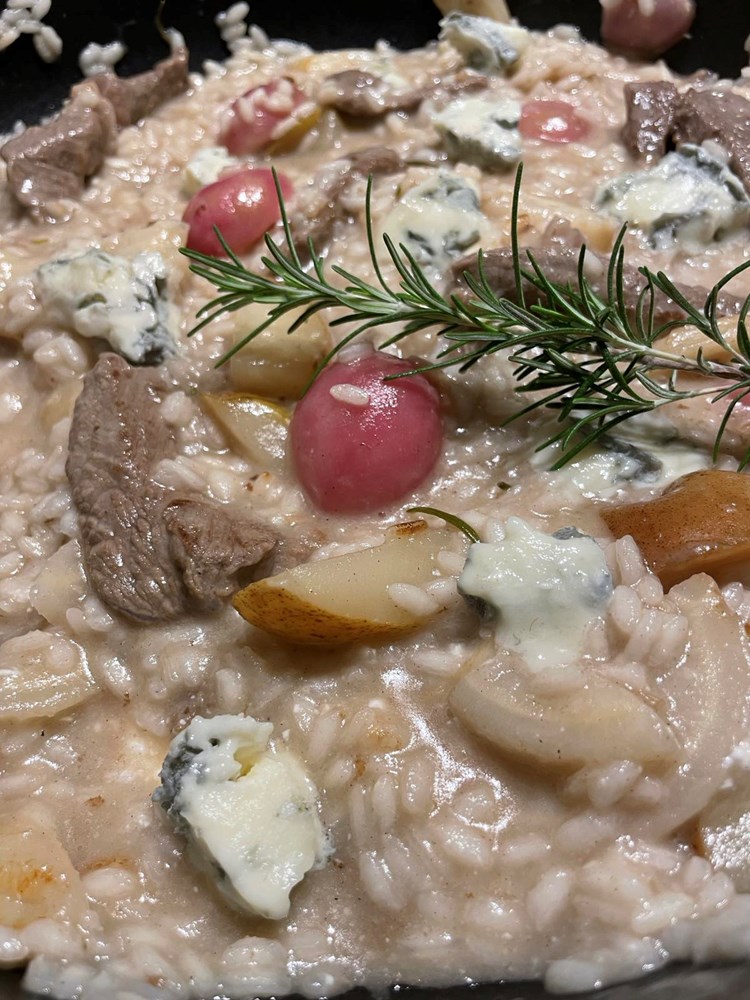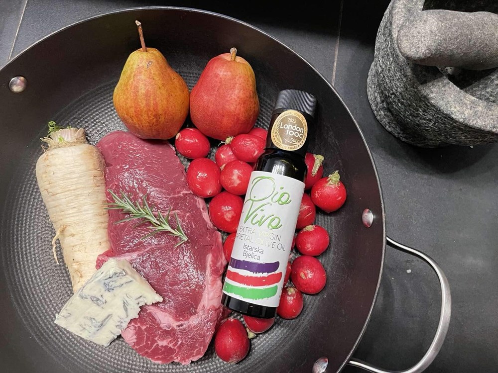 Gorgonzolu smo dodali jer se savršeno sljubljuje s kruškom. Sada smo dobili fuziju okusa: s jedne strane ramstek, rotkvicu, ružmarin, maslinovo ulje i rižu a s druge strane krušku i gorgonzolu. U ovome jelu kruška će vas iznenaditi jer će se svojim okusom ponašati kao bliži srodnik krumpira i batata… Ne znam kako vi, ali ja ću danas svoje jelo jesti sa svim guštima iz padele… zato i nisam uslikao fino dekorirani tanjur… dobar vam tek, i uživajte dragi ljudi… Vaš Outlaw.