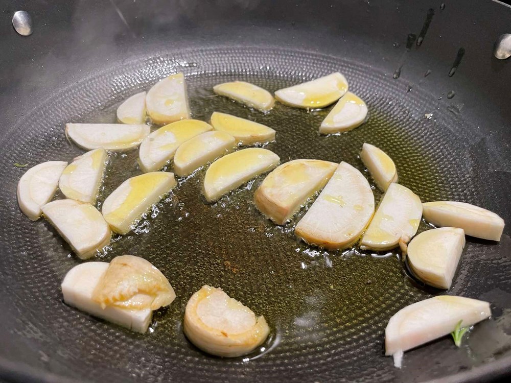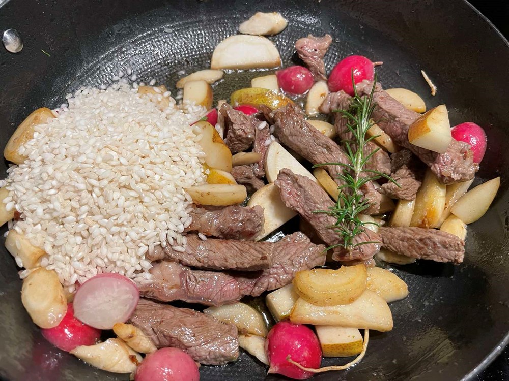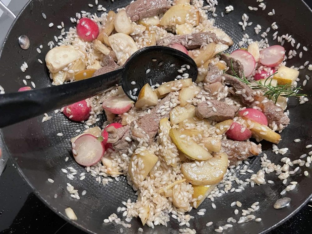 Zatim dodamo trakice kruške i polovice rotkvice, čajnu žličicu cvijeta morske soli, pa uz miješanje kuhačom dinstamo na srednje jakoj vatri cca 5 do 7 minuta. Nakon toga dodamo za dvije osobe cca 3 šake riže… Uz konstantno miješanje na srednje jakoj vatri sve ovo lagano pržimo sve dok riža ne postane staklastog izgleda, zatim dodamo 1,5 dcl vode (dodajem vodu a ne povrtni temeljac iz razloga što želim imati izdvojen okus kruške i rotkvice, povrtni temeljac bi ga izjednačio i dodao okuse luka i mrkve ili što ste već stavili u temeljac).