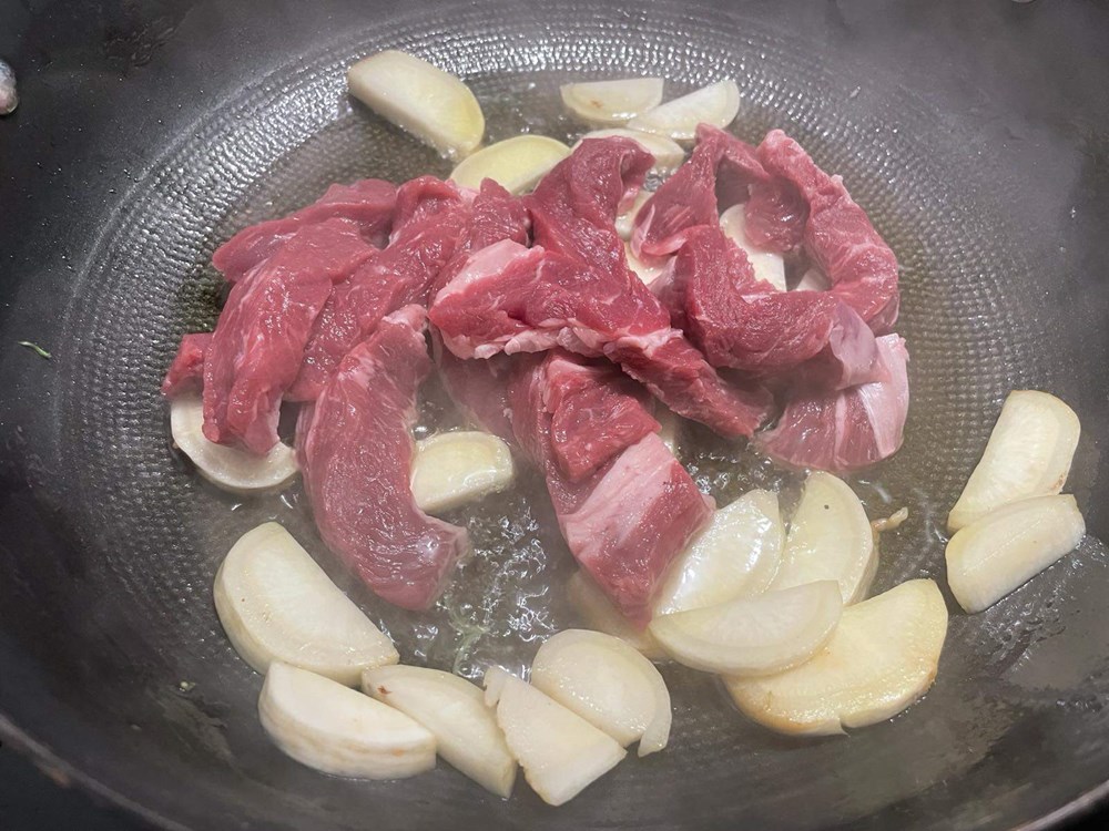 U poluduboku tavu na vrelo maslinovo ulje stavimo pržiti korijen celera, nakon cca 2 minute kada korijen lagano požuti dodamo trakice ramsteka pa tako uz miješanje sa celerom pržimo na srednje laganoj vatri minut i pol do dva.