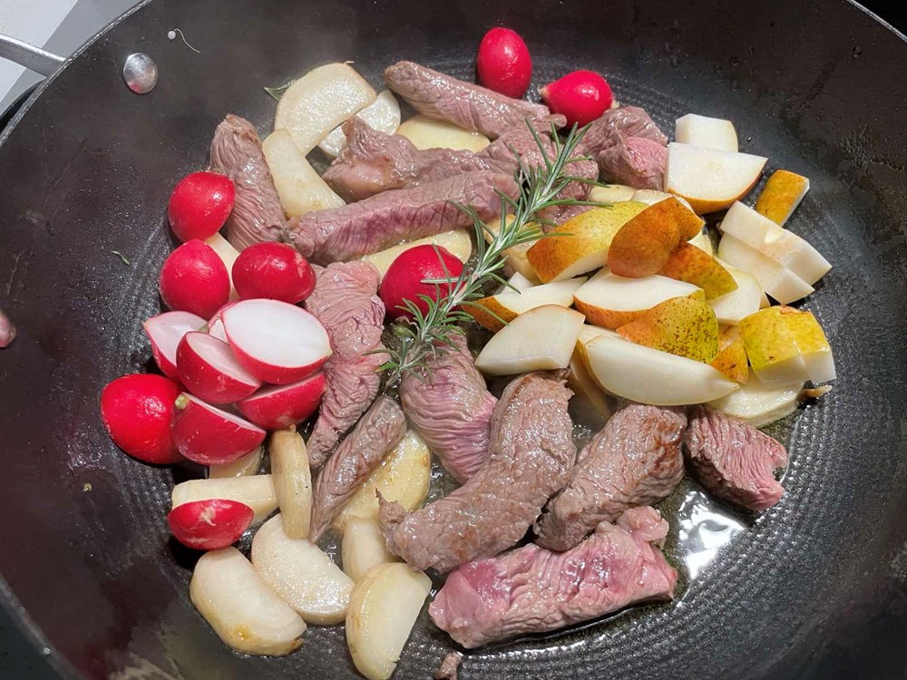 Ramstek izrežemo na trakice, rotkvicu na polovice, krušku na nešto manje trakice i očistimo ju od koščica, korijen celera razrežemo uzduž po pola pa na trakice.
