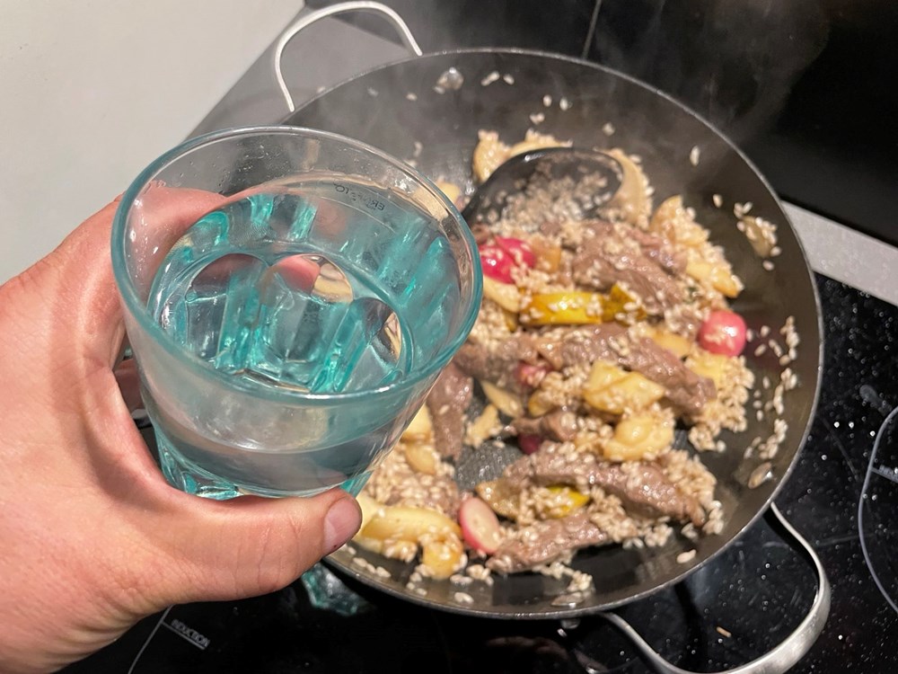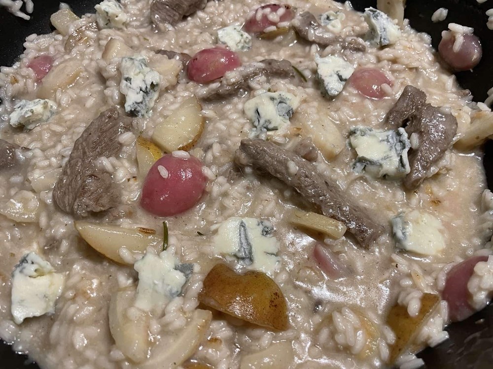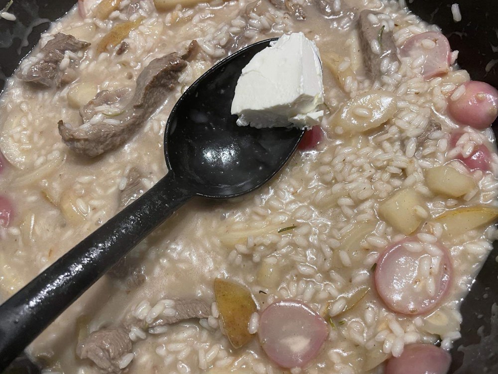 Miješamo konstantno idućih 15 do 20 minuta, te dodajemo vodu tek toliko da smjesa ostane vlažna i gusta. Nakon toga stavimo jednu jušnu žlicu mekanog slanog kravljeg sira i dobro izmiješamo da se sir rastopi i dobro umiješa između riže, ovo će rižotu dati ugodan slankasto mliječan ton koji se sljubljuje s rotkvicom, ramstekom i rižom. Maknemo tavu s izvora topline i dodamo cca 10-ak dkg gorgonzole koju smo rukom iskidali na komadiće pa ravnomjerno pobacali po površini rižota u tavi. Poklopimo poklopcem pa pustimo prije konzumacije da odstoji poklopljeno nekih 5 minuta.