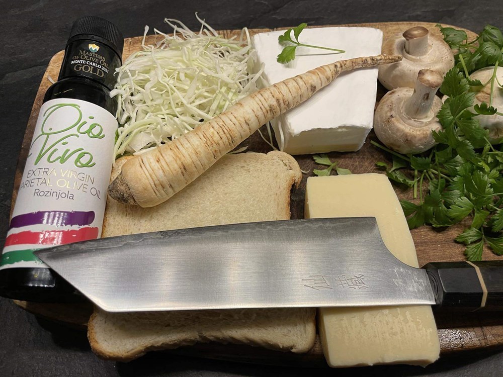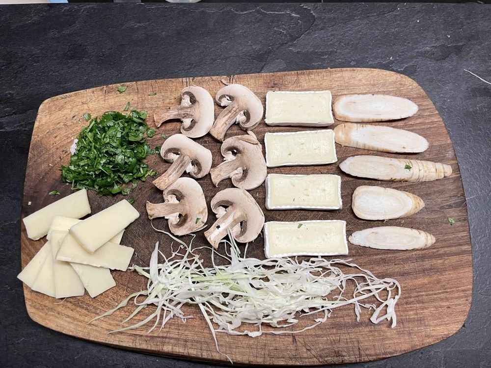 Oštrim nožem sir brie i sir gaudu narežite na listiće, korijen peršina na duguljaste fetice, šampinjone na tanke fetice, svježi kupus ribežom naribajte na tanko, nožem isjeckajte listove celera.