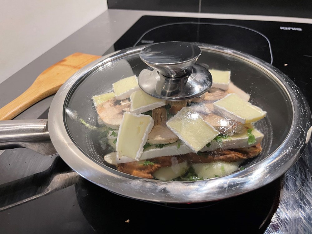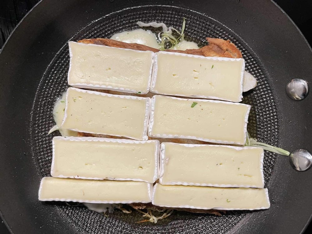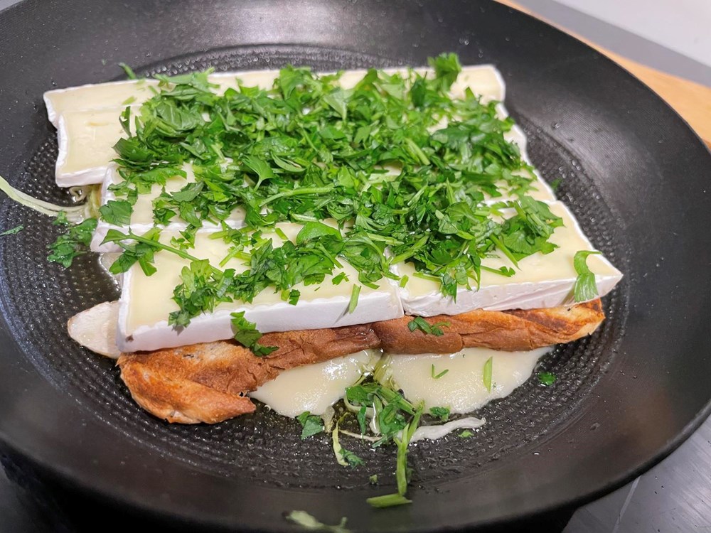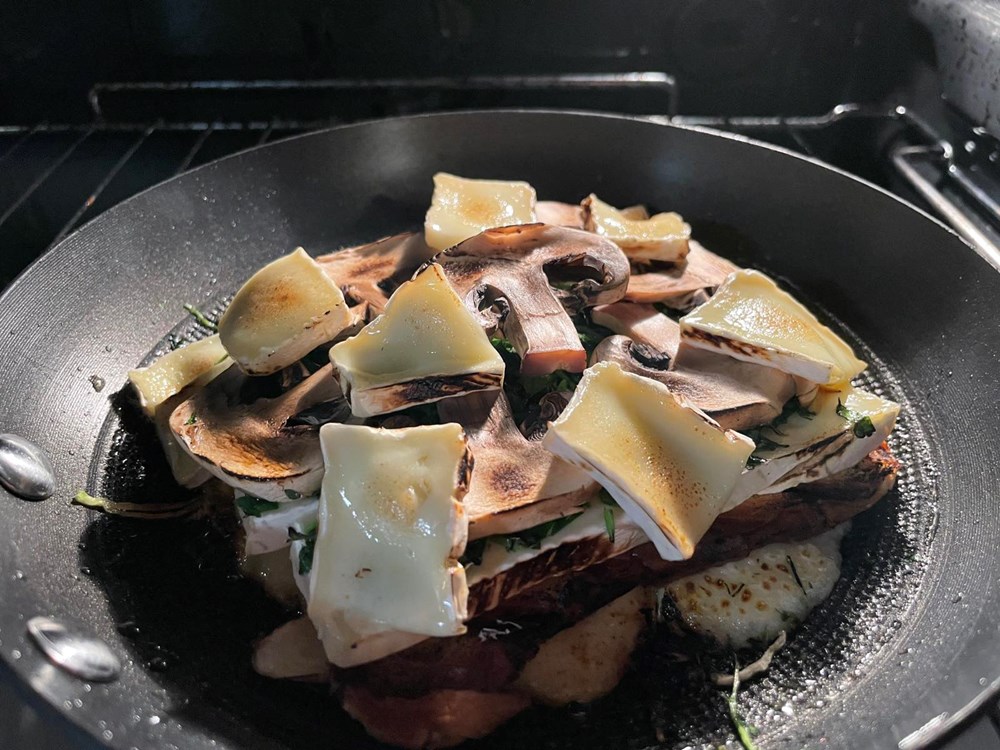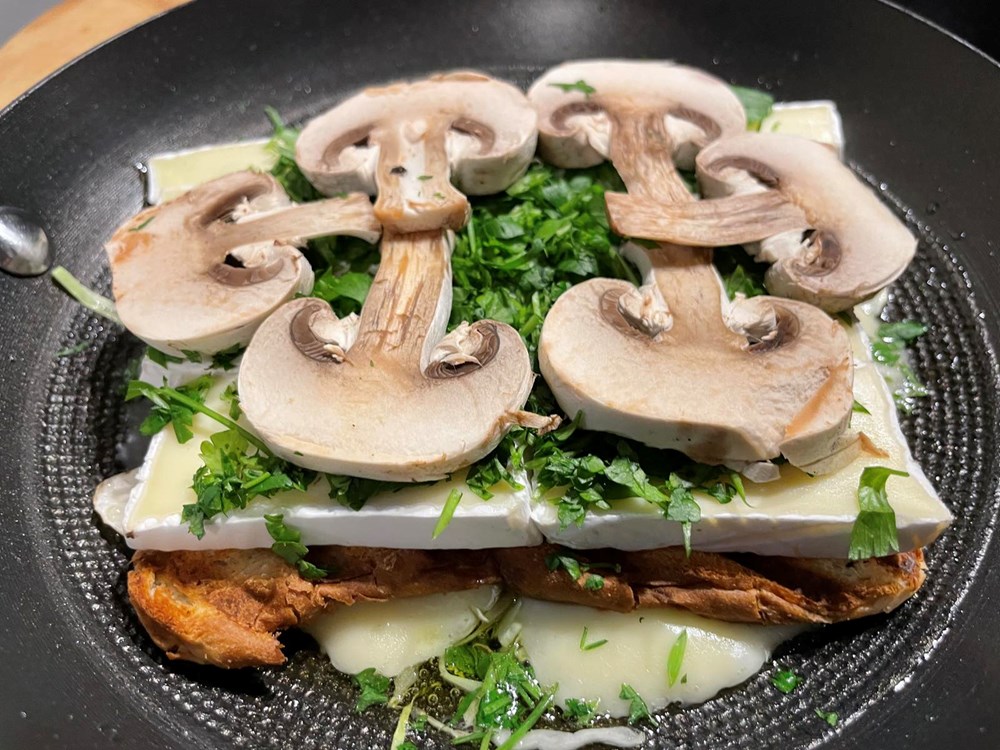 U tavu na zagrijano maslinovo ulje (na slaboj vatri) prvo stavite lagano pržiti naribani kupus, nakon cca 1 minute dodajte korijen celera pa onda nakon 2 minute dodajte sir gaudu. Kad se gauda nakon cca 2 minute smekša i počne lagano topiti, smanjite temperaturu na štednjaku na minimum i stavite fetu kruha koji ste prethodno istostirali u tosteru, odmah zatim na tu fetu kruha stavite brie sir kojeg ste izrezali na fetice pa na njega stavite izrezane listiće celera, na njih stavite izrezane fetice šampinjona a po šampinjonima dodajte još 4 do 5 fetica brie sira, tako kad se rastope i da drže gljive na okupu.