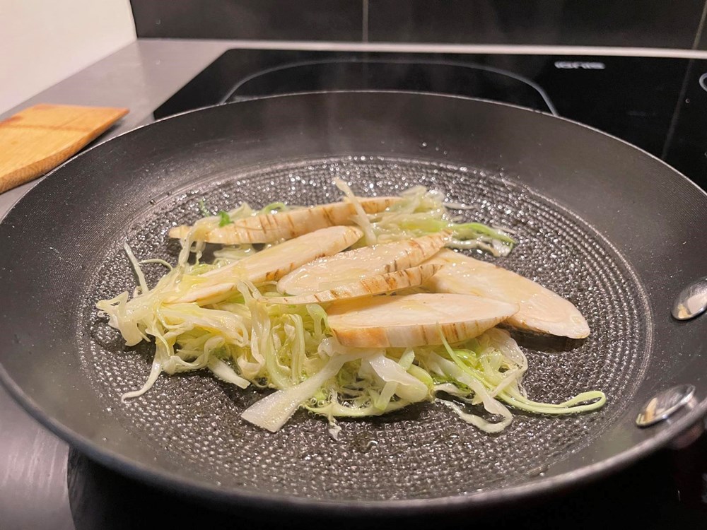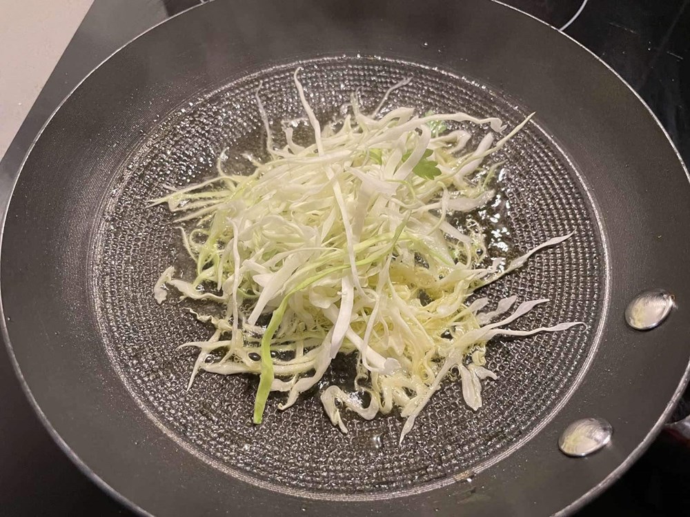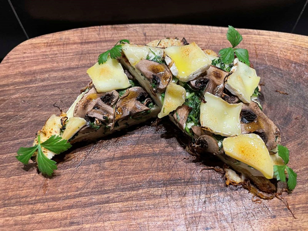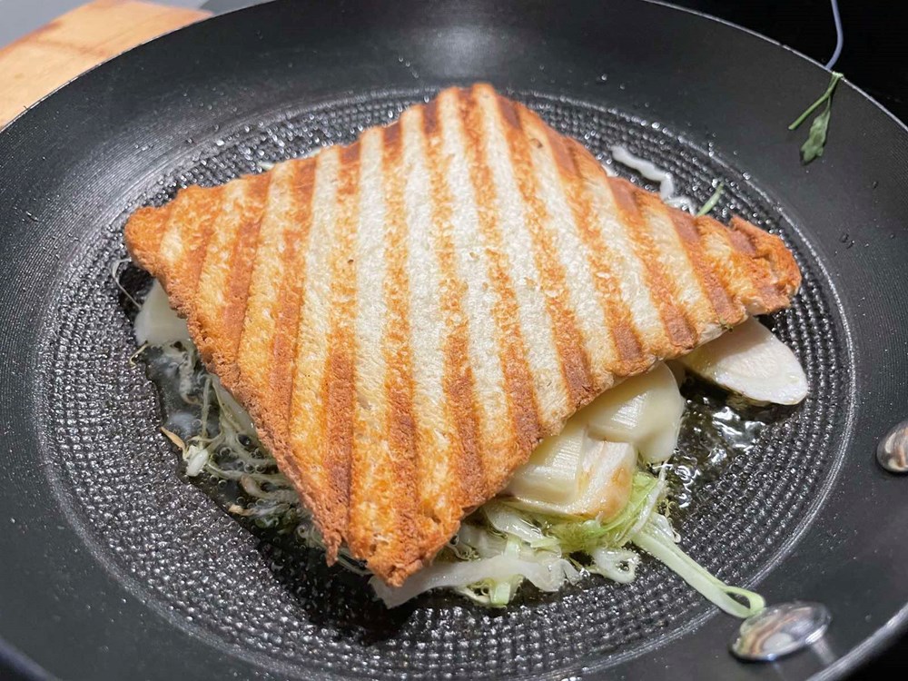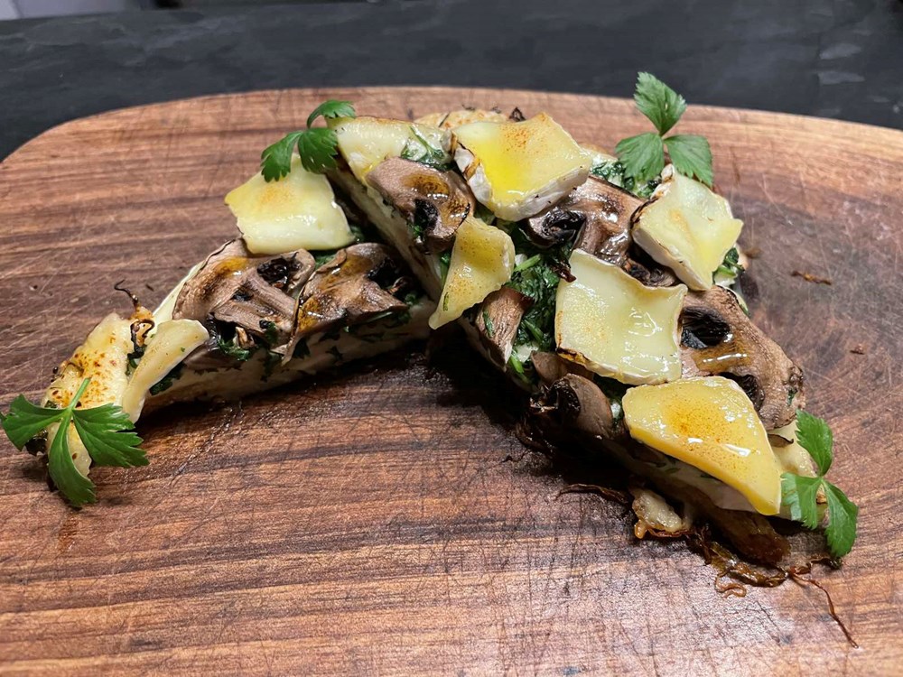 U tavu na zagrijano maslinovo ulje (na slaboj vatri) prvo stavite lagano pržiti naribani kupus, nakon cca 1 minute dodajte korijen celera pa onda nakon 2 minute dodajte sir gaudu. Kad se gauda nakon cca 2 minute smekša i počne lagano topiti, smanjite temperaturu na štednjaku na minimum i stavite fetu kruha koji ste prethodno istostirali u tosteru, odmah zatim na tu fetu kruha stavite brie sir kojeg ste izrezali na fetice pa na njega stavite izrezane listiće celera, na njih stavite izrezane fetice šampinjona a po šampinjonima dodajte još 4 do 5 fetica brie sira, tako kad se rastope i da drže gljive na okupu.