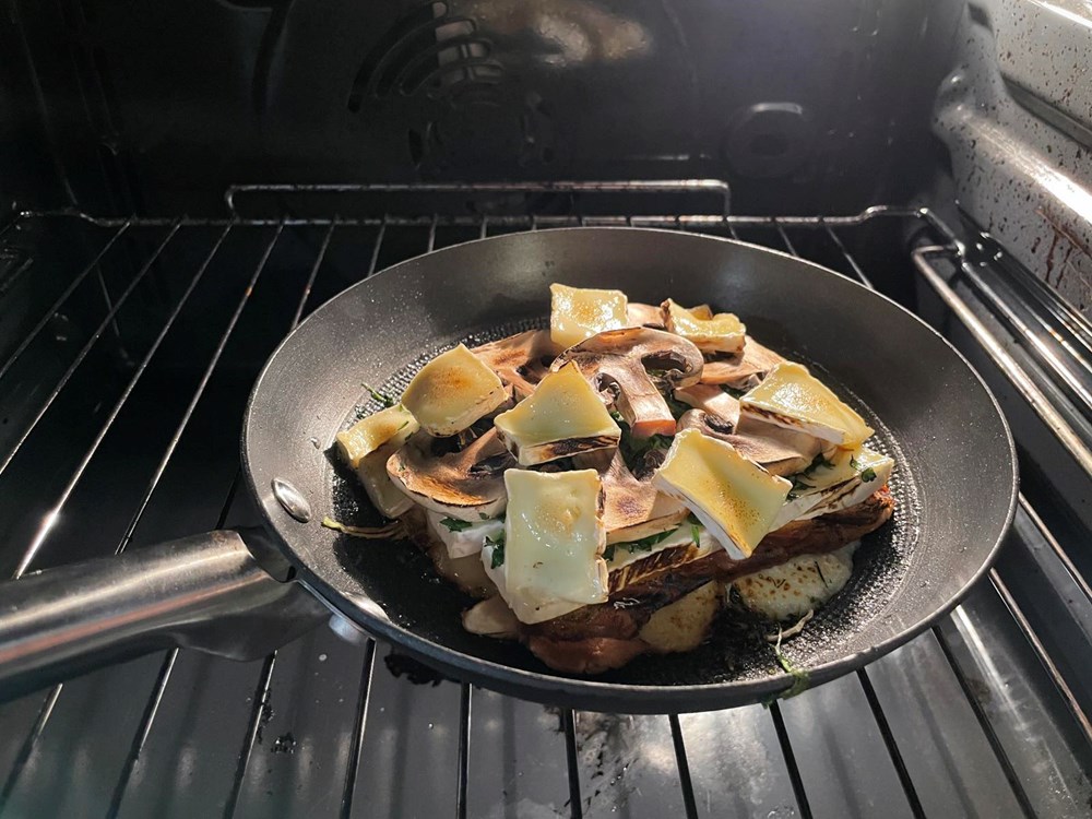 Sada poklopite tavu i na slaboj temperaturi držite još nekih 5 minuta. Istovremeno kad ste zaklopiti poklopac od tave namjestite temperaturu na pećnici na 200 stupnjeva Celzijusa. Nakon pet minuta na štednjaku, otklopite poklopac s tave te tavu s našim antigravitacijskim sandwichom prebacite u zagrijanu pećnicu. Naše NLO vozilo prema užitku nepca samo što nije gotovo… držite tavu sa sendvičem u pećnici na 200 stupnjeva Celzijusa nekih pet minuta dok gljive i sir na površini ne dobiju mjestimice smećkaste tonove, izvadite tavu iz pećnice a vaš sandwich servirajte na kuhinjskoj radnoj dasci za rezanje, prelijte ga s par kapi maslinovog ulja i dodajte dekoracije radi par svježih listova celera i… poletite s vašim Antigravitacijskim sandwichem u sfere užitaka među oblake vašeg nepca… živjeli dragi ljudi… vaš Outlaw.