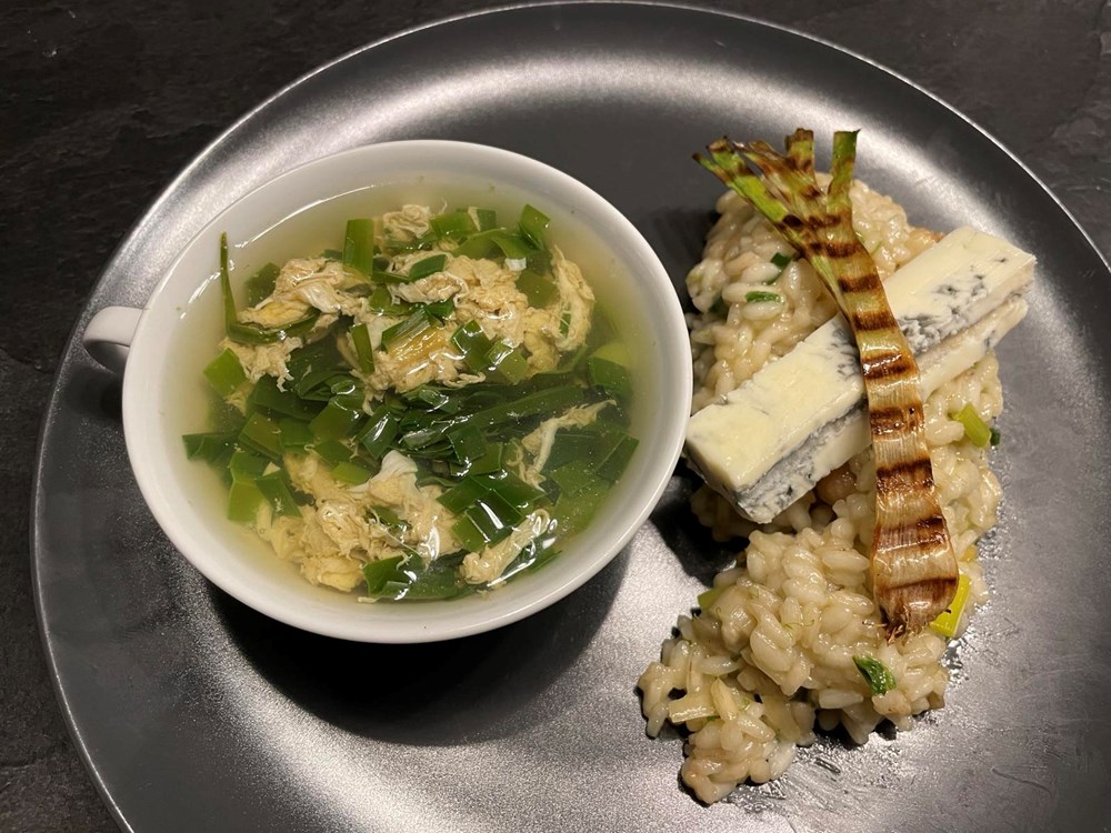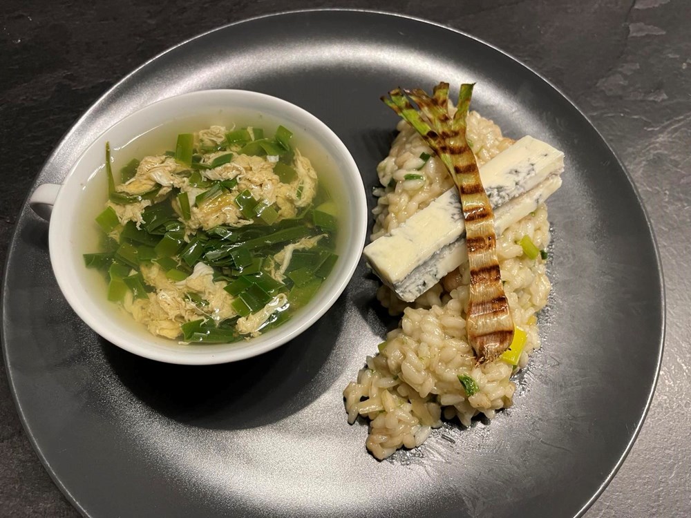 Konstantno miješamo i dodajemo temeljac, ali tek toliko da smjesa od riže i poriluka bude kremasta. Nakon nekih 15 do 17 minuta konstantnog miješanja maknemo tavu sa izvora topline dodamo još pola jušne žlice maslinovog ulja promiješamo dobro još jedanput i pustimo 5 minuta naš rižoto da odstoji… Za to vrijeme u manjoj zdjeli izmutimo vilicom jedno jaje i ubacimo ga uz konstantno miješanje u manji lonac u kojem kuhamo temeljac od divljeg poriluka… nakon tri do četiri minute miješanja jaja i listića poriluka dobili smo okrjepljujuću povrtnu juhicu punu minerala s elementima bijelančevina u sebi…