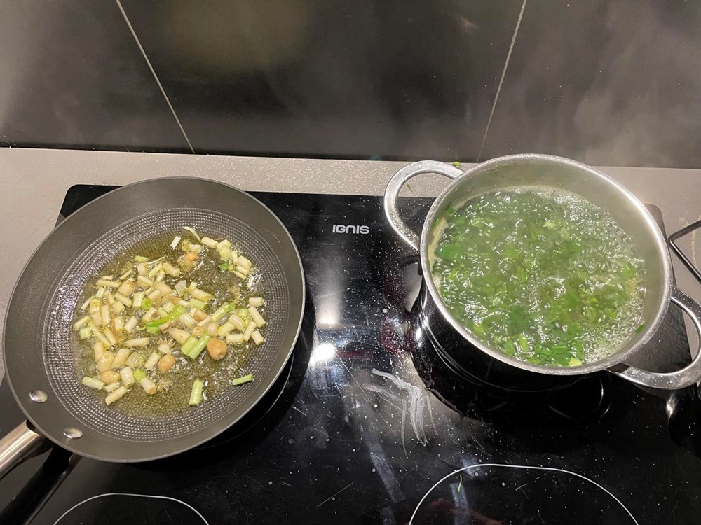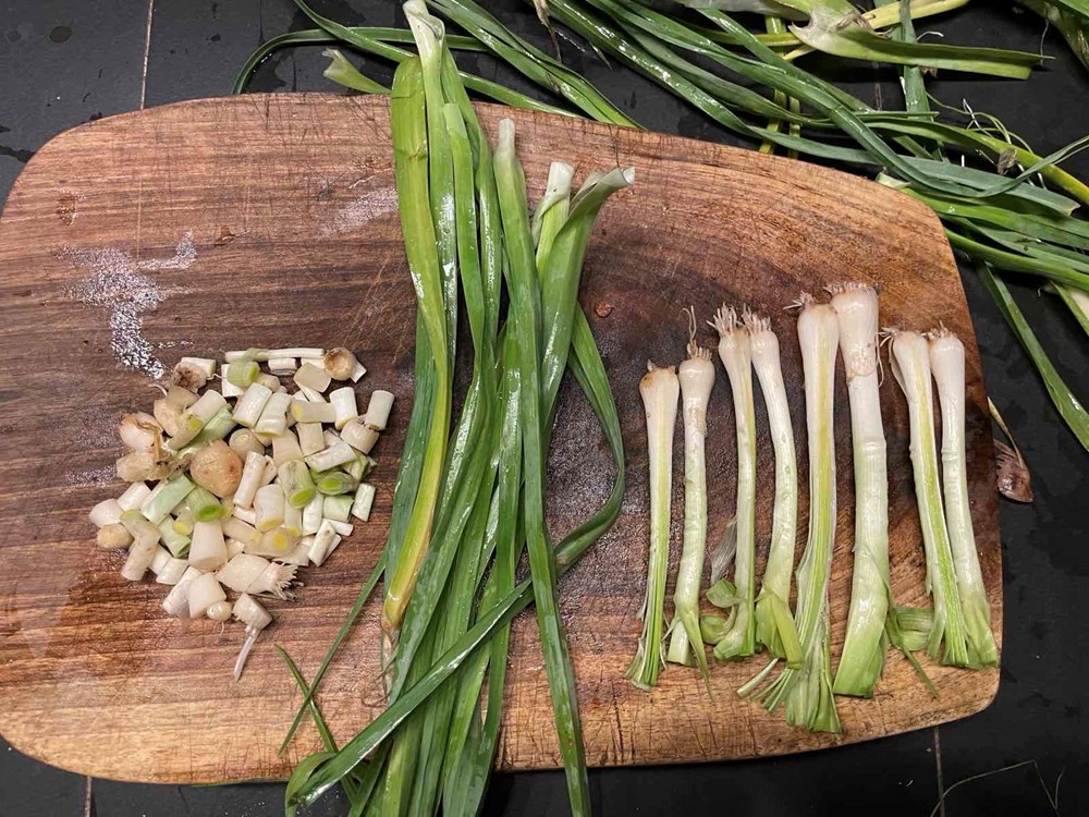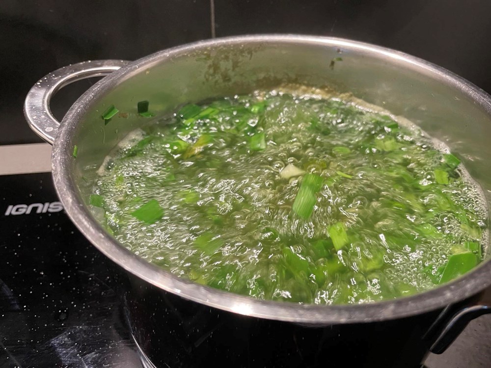 Oštrim nožem izdvojimo zelene listove i bijeli korijen od poriluka. Zelene listove razrežemo na sitne kockice a bijeli podzemni dio poriluka na kolutiće srednje veličine. U loncu zakipimo 1 litru vode u koju smo stavili pola čajne žličice soli. Kada je voda zakipila, u nju ubacimo zelene listove divljeg poriluka narezane na kockice, vatru smanjimo na srednje…