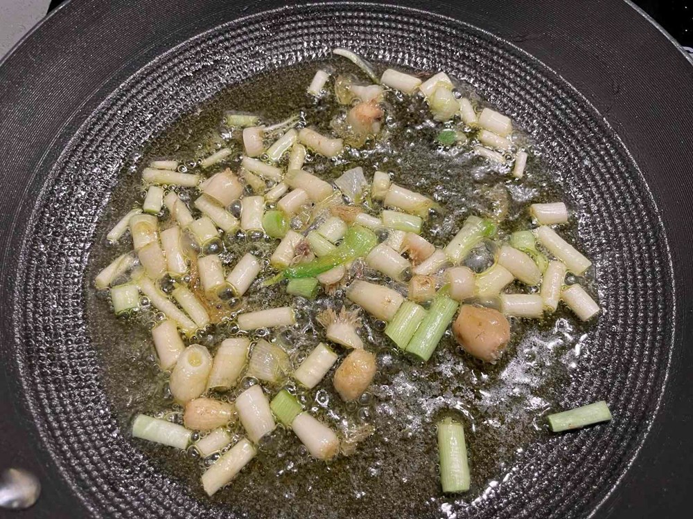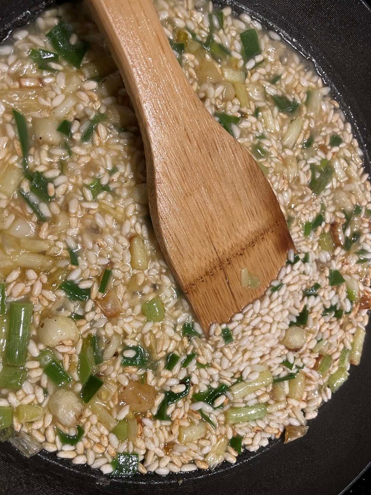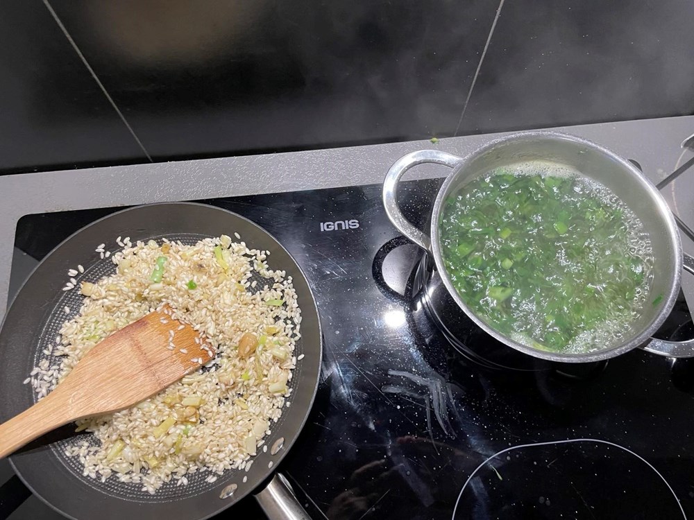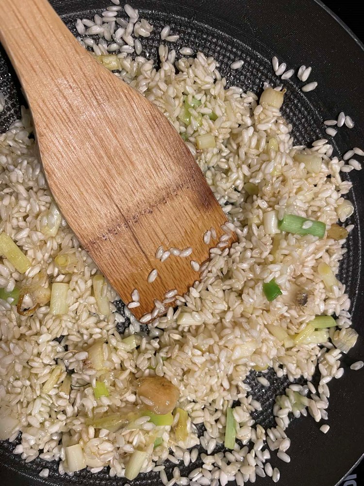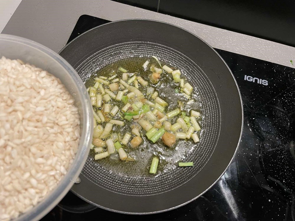 Nakon pet minuta nakon što je voda zakipila u loncu, pored njega stavimo tavu s maslinovim uljem (dvije jušne žlice) također na srednje jaku vatru, pa kad se ulje zagrije lagano pržimo podzemni bijeli dio divljeg poriluka narezan na srednje velike komade. Nakon cca 5 minuta dodamo tri šake riže pa ju konstantno miješamo dok riža ne postane prozirnkasta, zatim dodamo malu kaciolu "temeljca" od divljeg poriluka kojeg kuhamo sa strane na srednje jakoj vatri pored tave. Kada dodamo temeljac u rižu na tavi neka u njemu uz tekućinu slobodno budu i nasjeckani zeleni listovi poriluka.