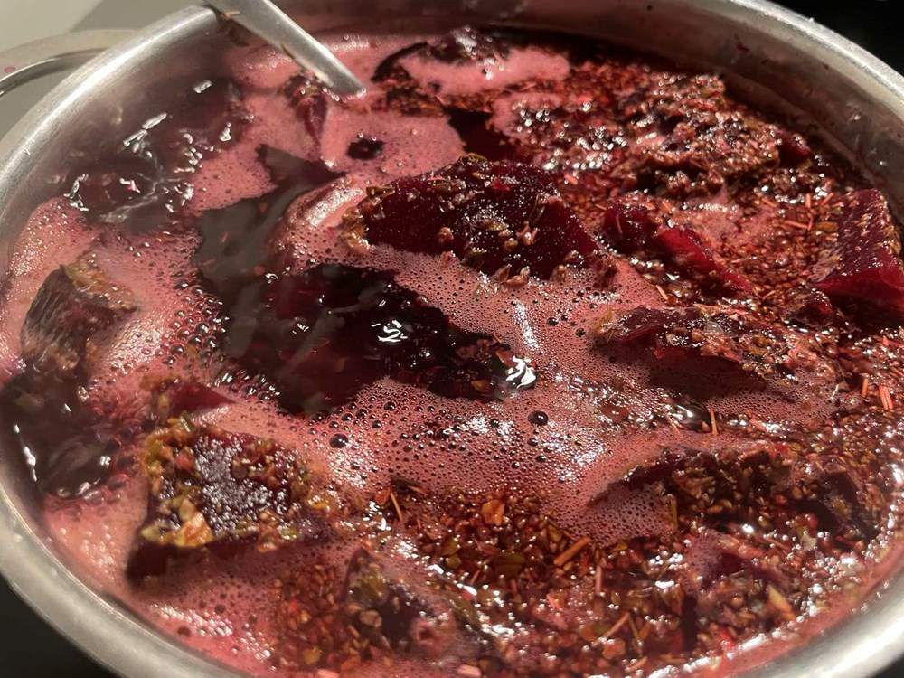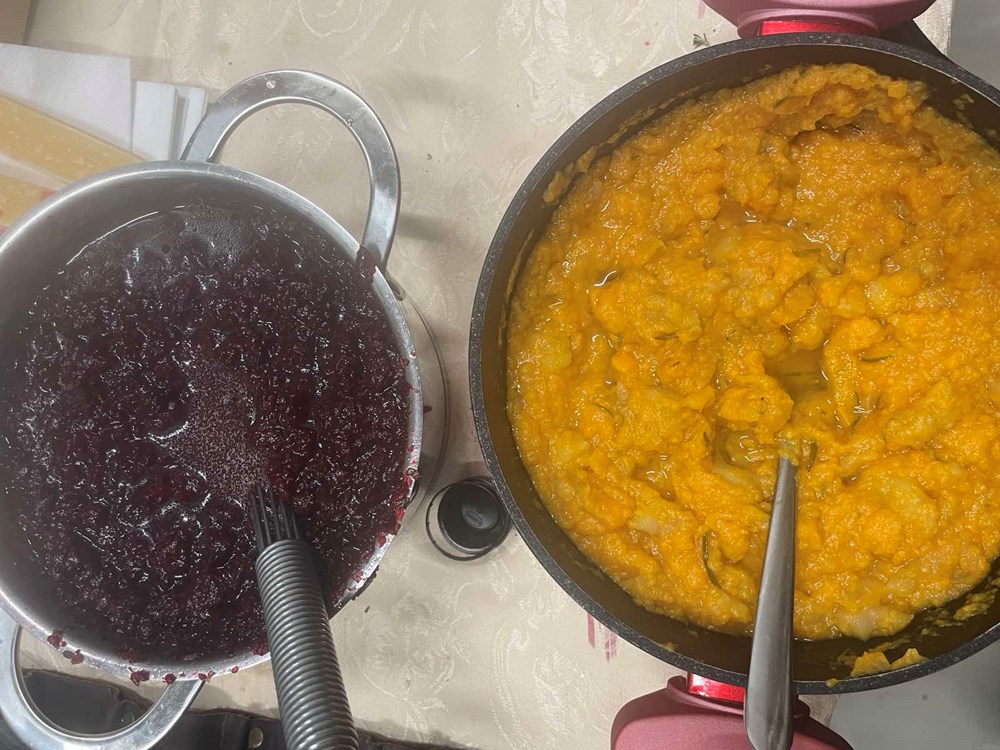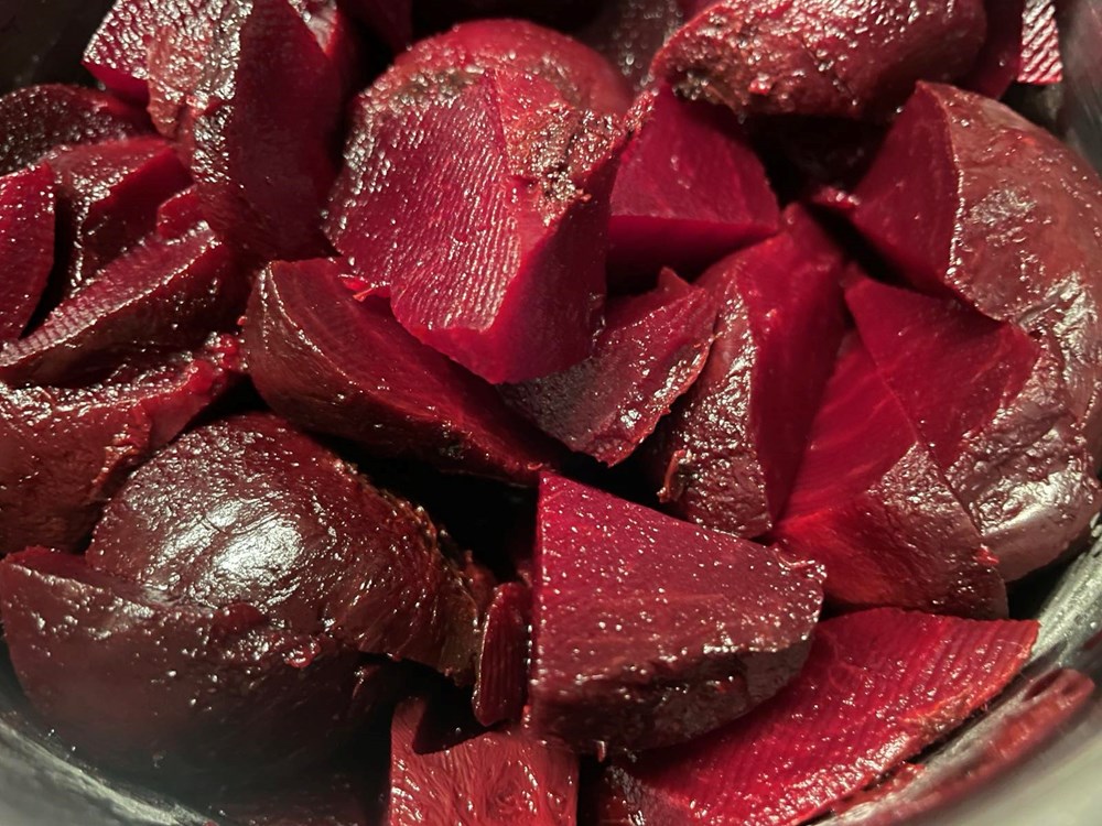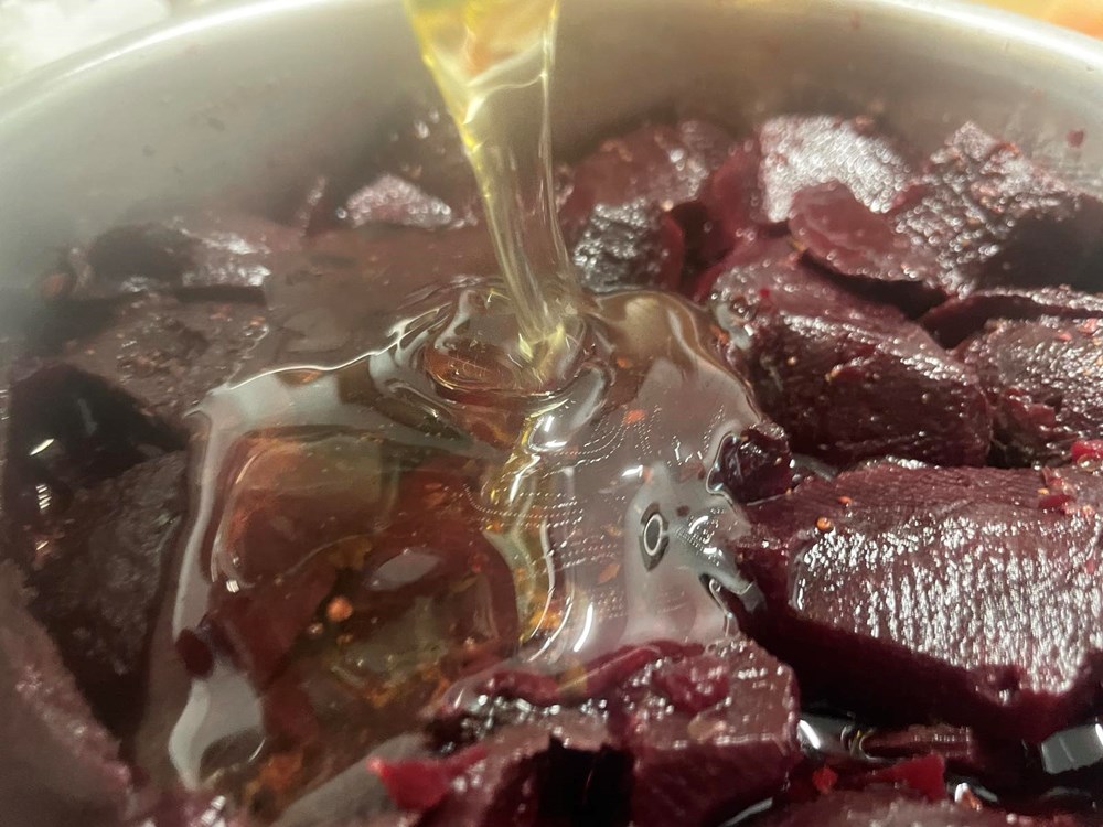 2) Za umak od cikle: Sirovoj cikli ogulite koru, pa je narežite na komadiće nešto veće od zrna graha. Tako nasjeckanu ciklu stavite kuhati u kipuću slanu vodu i kuhajte ju nekih 25 do 30 minuta. Pet minuta prije kraja kuhanja ubacite u kipuću vodu sa ciklom dvije i pol čajne žličice sušenog origana pa kuhajte tako u kipućoj vodi još pet minuta, zatim ju maknite sa izvora topline i procijedite. U okruglu zdjelu stavite ciklu kuhanu s origanom, dodajte jušnu žlicu meda, pola čajne žličice cvijeta morske soli i južnu žlicu maslinovog ulja. Gnječilicom sve dobro izgnječite dok ne dobijete kompaktnu smjesu. Stavite po strani.