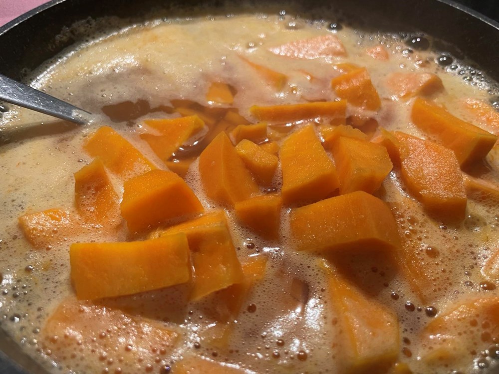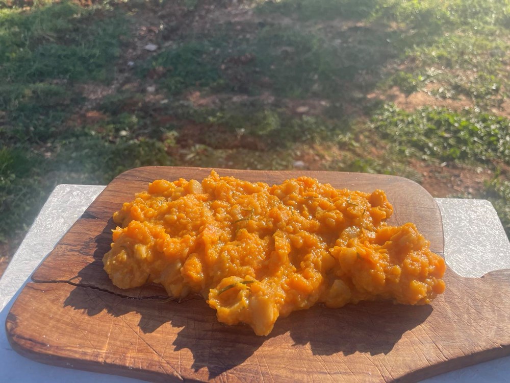 U okrugloj zdjeli gnječilicom izgnječite jabuku koju ste kuhali s ružmarinom, batat i jednu jušnu žlicu maslinovog ulja… gnječite sve dok ne dobijete kompaktnu smjesu, pa stavite po strani.