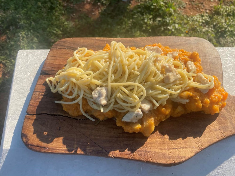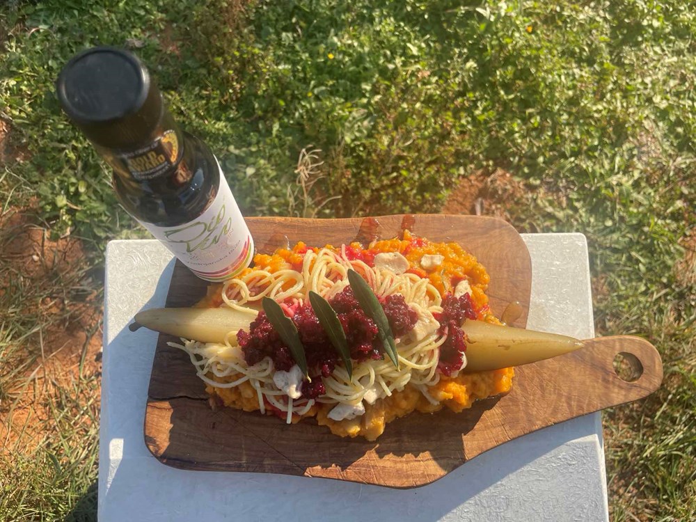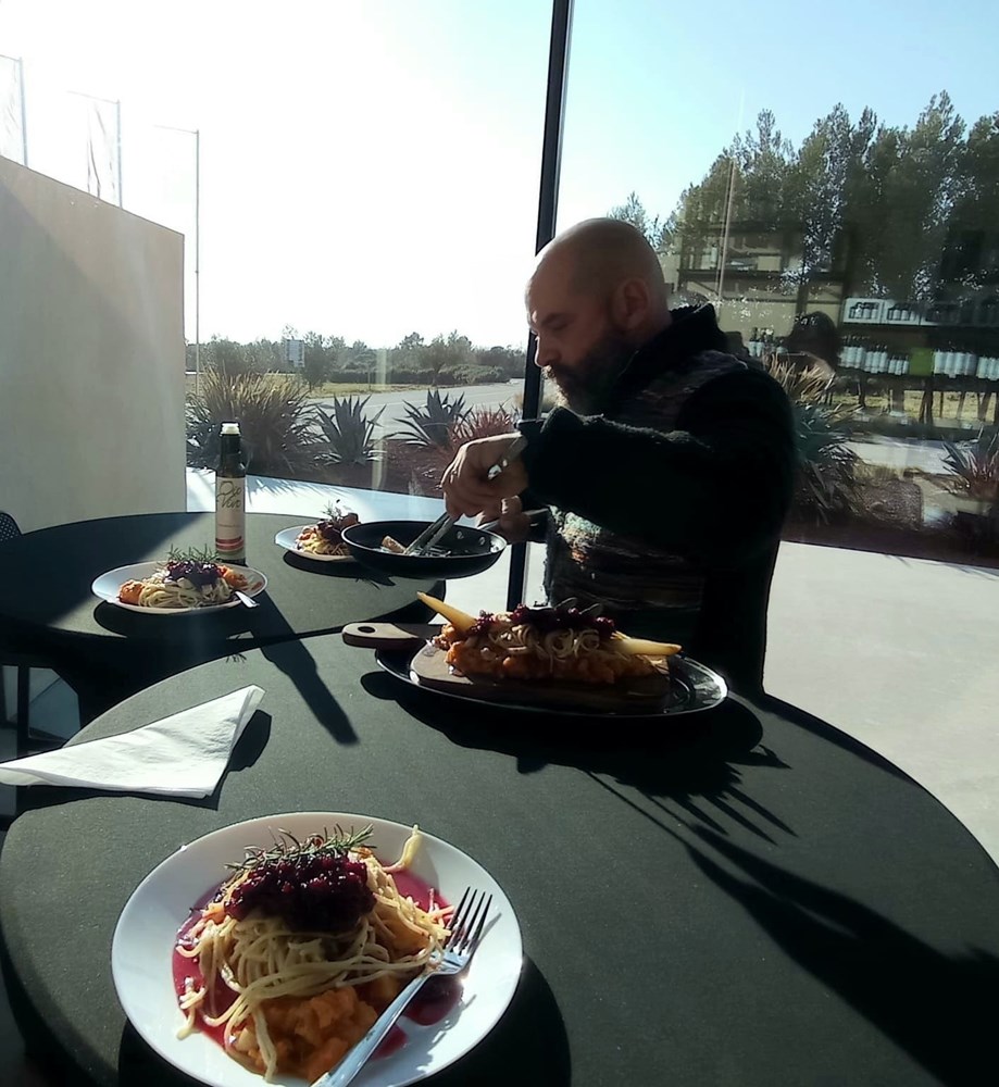 5. Slaganje tanjura: Na dno ravnoga velikog tanjura stavite veliku žlicu i pol umaka od jabuke, batata i ružmarina. Na umak od jabuke, batata i ružmarina velikom vilicom ili velikom kuharskom pincetom stavite špagete s piletinom i Grana padanom. Na špagete stavite veliku žlicu umaka od cikle, meda i origana. Sa strane u špagete zabodite četvrtinu kruške dinstane u lovoru a za dekoraciju po umaku od cikle možete staviti tri svježa lista masline (ako ih nemate i ne morate, možete staviti neke druge listiće koje imate pri ruci)… Dakle dobar Vam tek, dragi moji ljudi… uživajte u fuziji blagog preplitanja okusa i osjećaja koji se u vama bude dok vam nepca analiziraju eteriku ovog jela… Vaš Outlaw… Yhaaaaaaa!