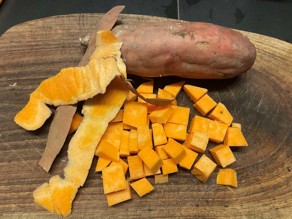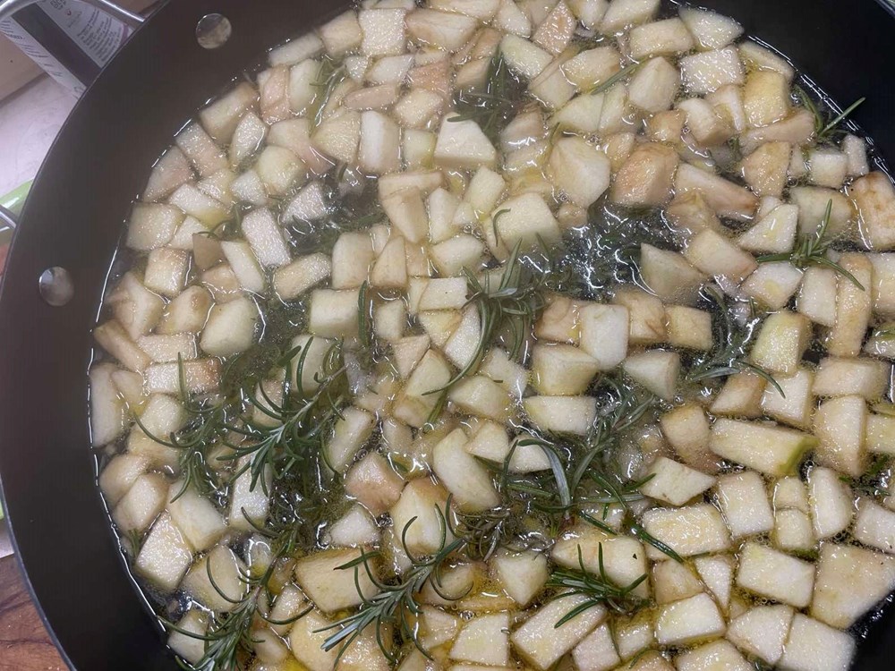 1) Za umak od jabuke, batata i ružmarina: ogulite batat, narežite ga na kockice nešto veće od zrna graha i kuhajte ga u slanoj kipućoj vodi dvadesetak minuta. Maknite ga s izvora topline i procijedite. Ogulite jabuku, narežite ju na kockice nešto veće od zrna graha i kuhajte ju u slanoj kipućoj vodi sa 4 grančice ružmarina 10 minuta. Jabuku maknite s izvora topline i procijedite.