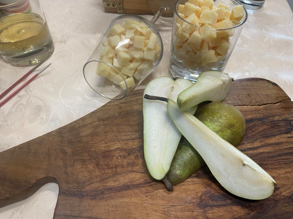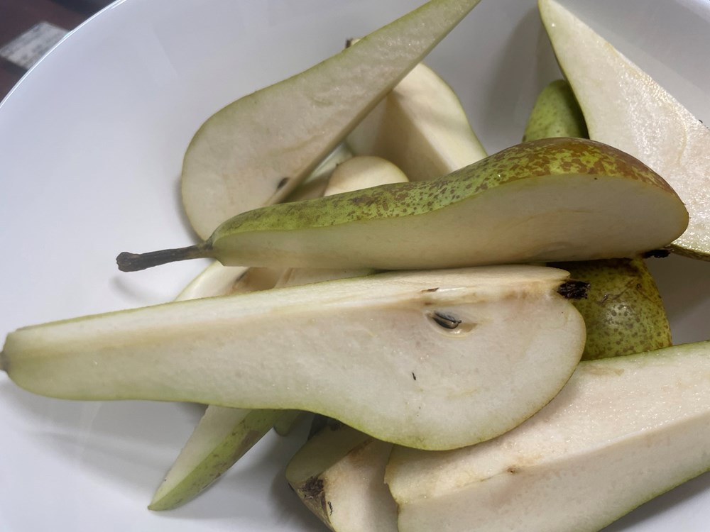 3. Dinstana kruška: Krušku oštrim nožem izrežite na četvrtine pa ju u kipućoj slanoj vodi sa 7 listova lovora kuhajte 15 minuta. Zatim ju maknite s izvora topline i ostavite da malo odleži u vodi s lovorom u kojoj se kuhala.