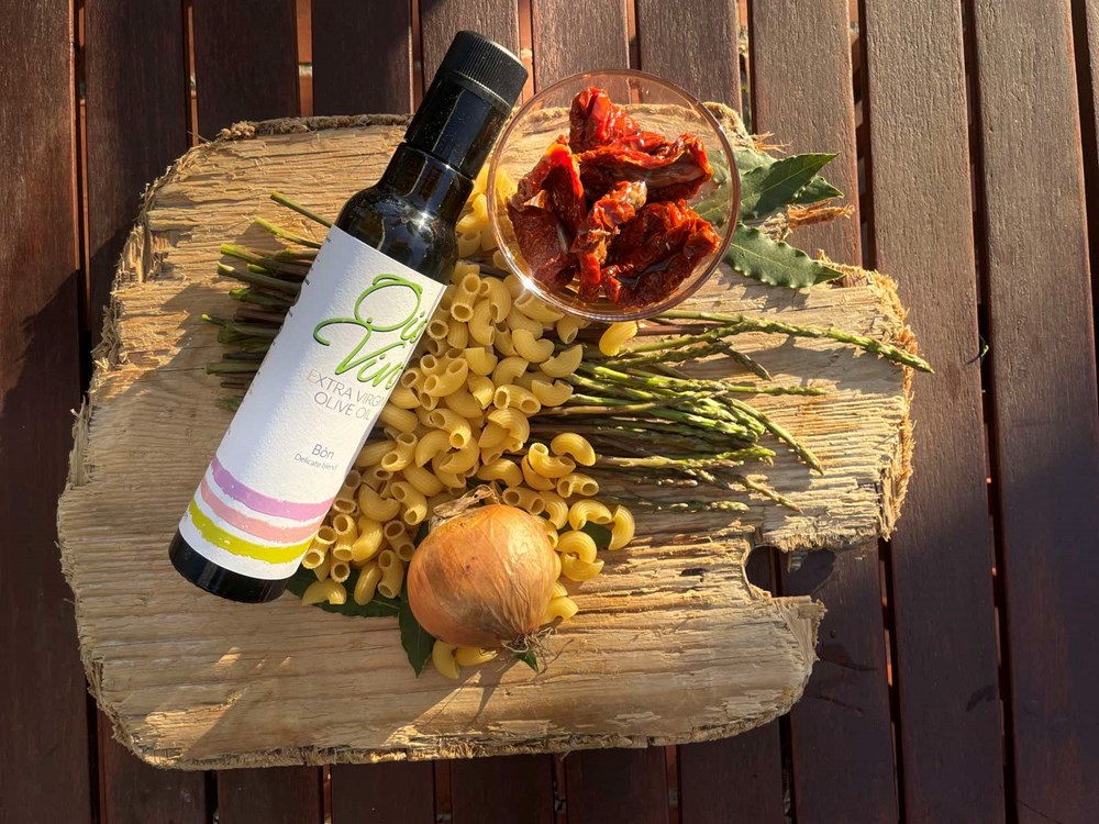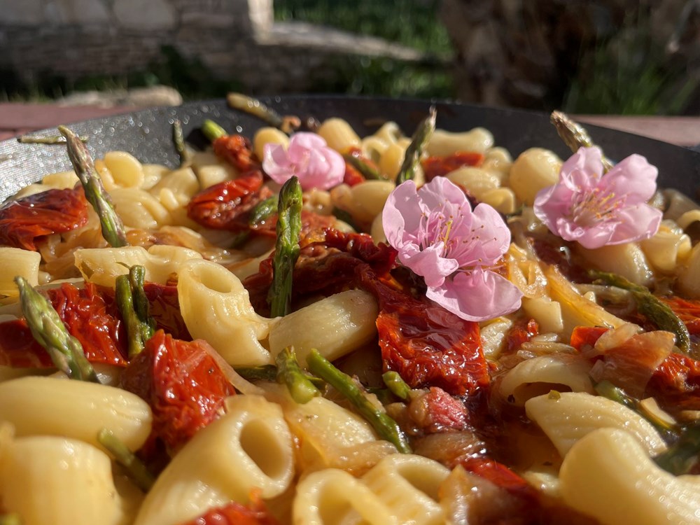 Tri bijela oblaka stoje na plavom nebu a ja se u papučama i kućnom ogrtaču gegam prema masliniku. Baš me briga što sam takav izašao… opušten sam… jer znam… cijeli je svijet moja kuća… šećem među drvećem višestoljetnih maslina i uživam u mirisima njihova lišća i u jutarnjoj pjesmi žamora kojeg stvaraju u simfoniji s vjetrom… kad ono… A HA! Evo je prva proljetna šparuga odmah tu podno grbavog korijena masline... nešto dalje iznikla je još jedna… Desetak minuta kasnije s osmjehom na licu u frekvenciji svijeta koji me trenutno okružuje s tridesetak šparuga u ruci ulazim u kuhinju, stavljam šparuge na stari drveni izlizani stol, instiktivno uzimam teglu sušenih pomidora, a s police skidam drugu teglu u kojoj se nalazi tjestenina "Pipe rigate" i znam… da i danas kuham…