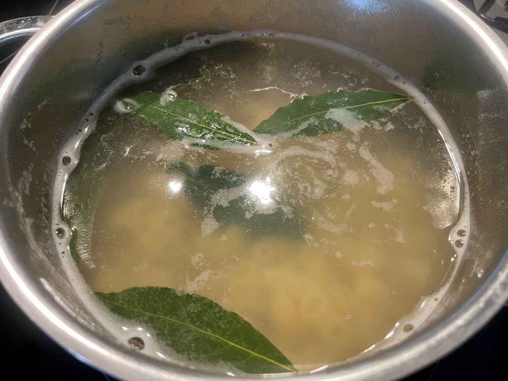 U slanu i kipuću vodu stavimo kuhati 25 dkg tjestenine pužići i 7 listova svježeg lovora (ne brinite ako je lovor svježe ubran, neće ostaviti agresivan okus, ali ako je lovor sušeni onda dodajte samo dva lista lovora).