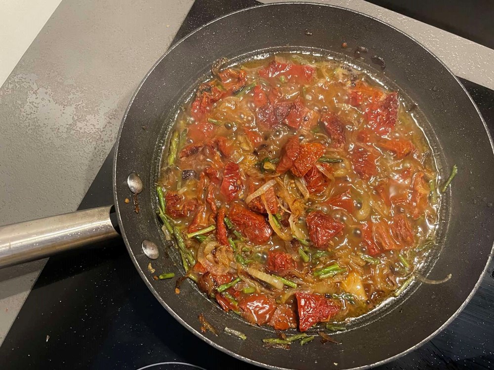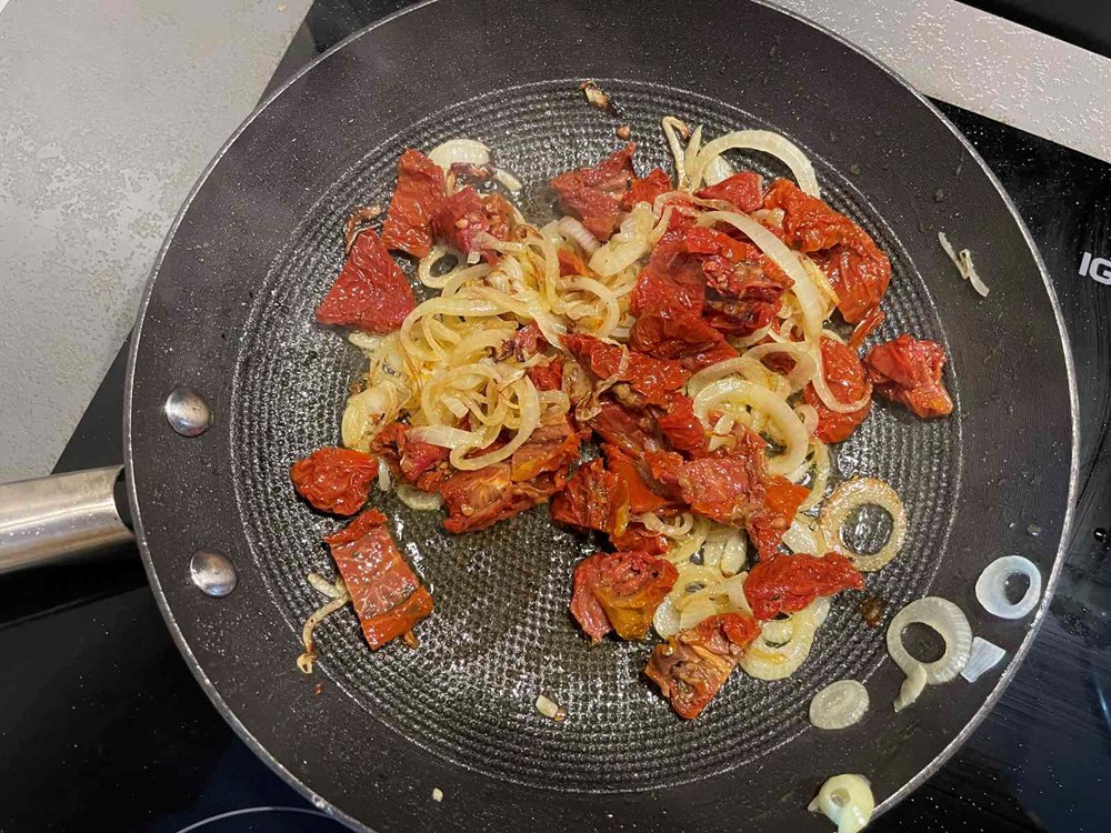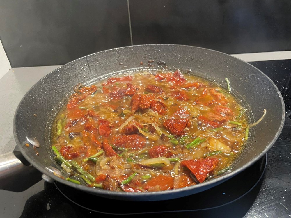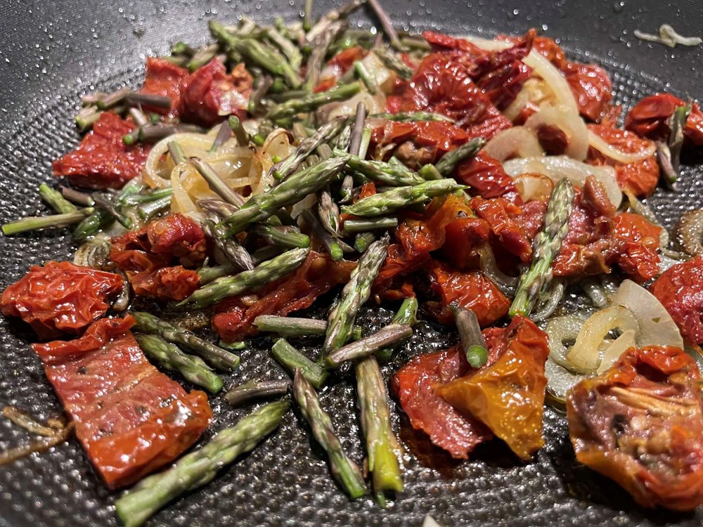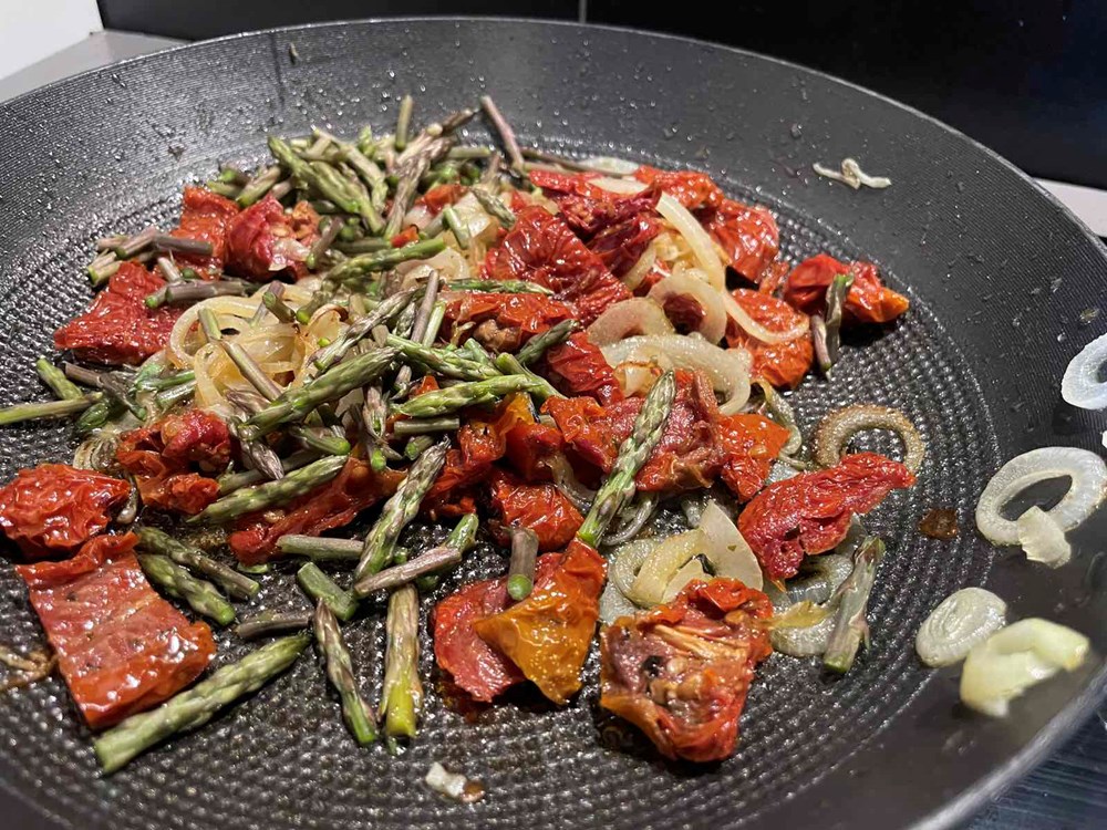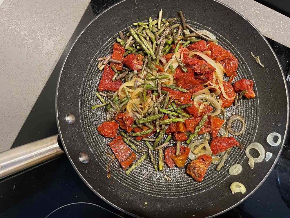 U tavi na zagrijanom maslinovom ulju na laganoj temperaturi pržite kolutiće luka sve dok lagano ne požute. Nakon toga dodajte trakice od sušene rajčice. Nakon tri minute prženja na laganoj vatri dodajte iskidane šparuge.