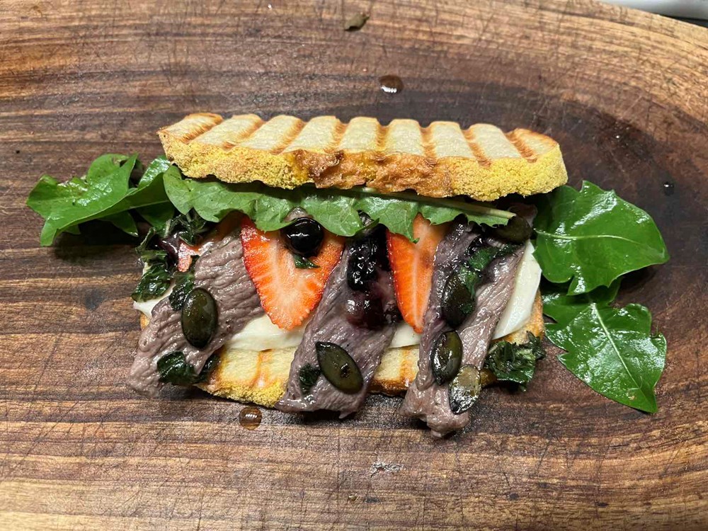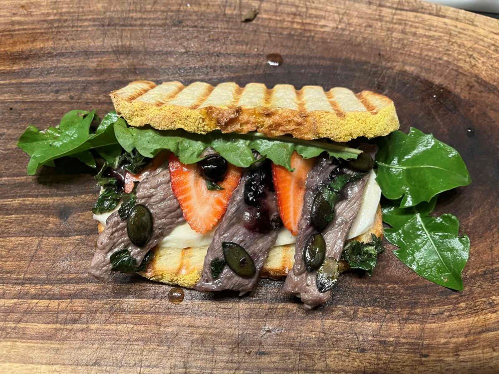 Na ravni tanjur ili na servirnu dasku postavite istostiranu fetu kruha. Po donjoj feti kruha složite fete mozarelle. Na fete mozarelle posložite trakice ramsteka. Između trakica ramsteka stavite fete svježe jagode. Po svemu ovome ležerno pobacajte mentu, borovnicu i bučine sjemenke s kojima ste pržili ramstek. Sve prekrijte s nekoliko listova maslačka pa na pola preklopite gornjom fetom istostiranog kruha. Poprskajte sve s nekoliko kapi maslinovog ulja… i uživajte u okusima koji se isprepliću i miluju čaše nepce… dobar vam tek dragi ljudi… Vaš Outlaw…