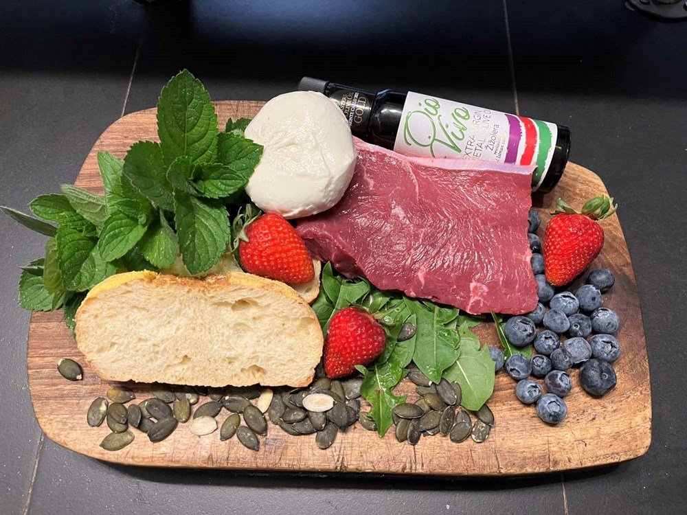 E sad, u ovakvom blaženom stanju je najbolje vrijeme za kuhanje i smišljanje novog recepta… tek kad je tijelo umrtvljeno, čista misao dolazi do izražaja… osmijeh poput izlaska sunca na horizontu počinje svitati na mojemu licu… uzimam svoj notes u kojeg pišem i "škrabam" svakojake recepte i krenem … na pamet mi pada ramstek, jagoda, divlji maslačak i feta kukuruznog kruha… kako to spojiti… pitam samog sebe negdje u dubini svoje podsvijesti koja je trenutno isplivala na površinu tijela… pojavljuju mi se slike mozarelle, sjemenki od buče , svježe mente i jagode… to je odgovor - time ću spojiti gore navedene namirnice i dobiti priču o okusima koji se međusobno sljubljuju... dakle… 3,2,1… zakuhajmo!