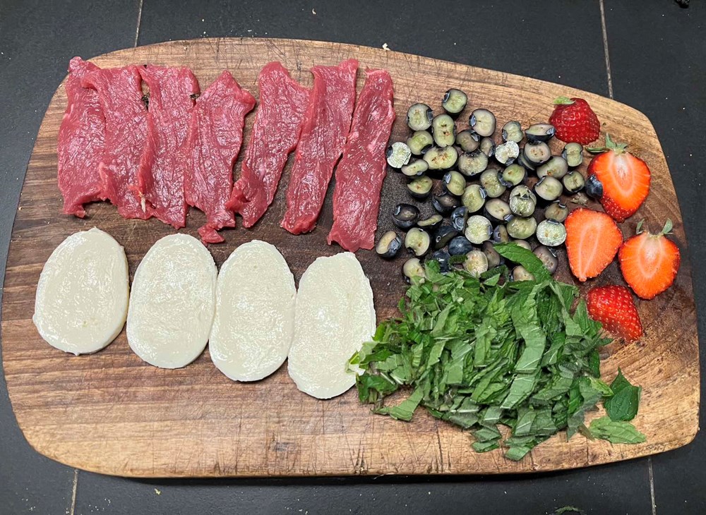 Ramstek narezati na trakice. Jagodu narezati na fetice, listove svježe mente narezati na tanke trakice. Mozarellu narezati na tanke fete.